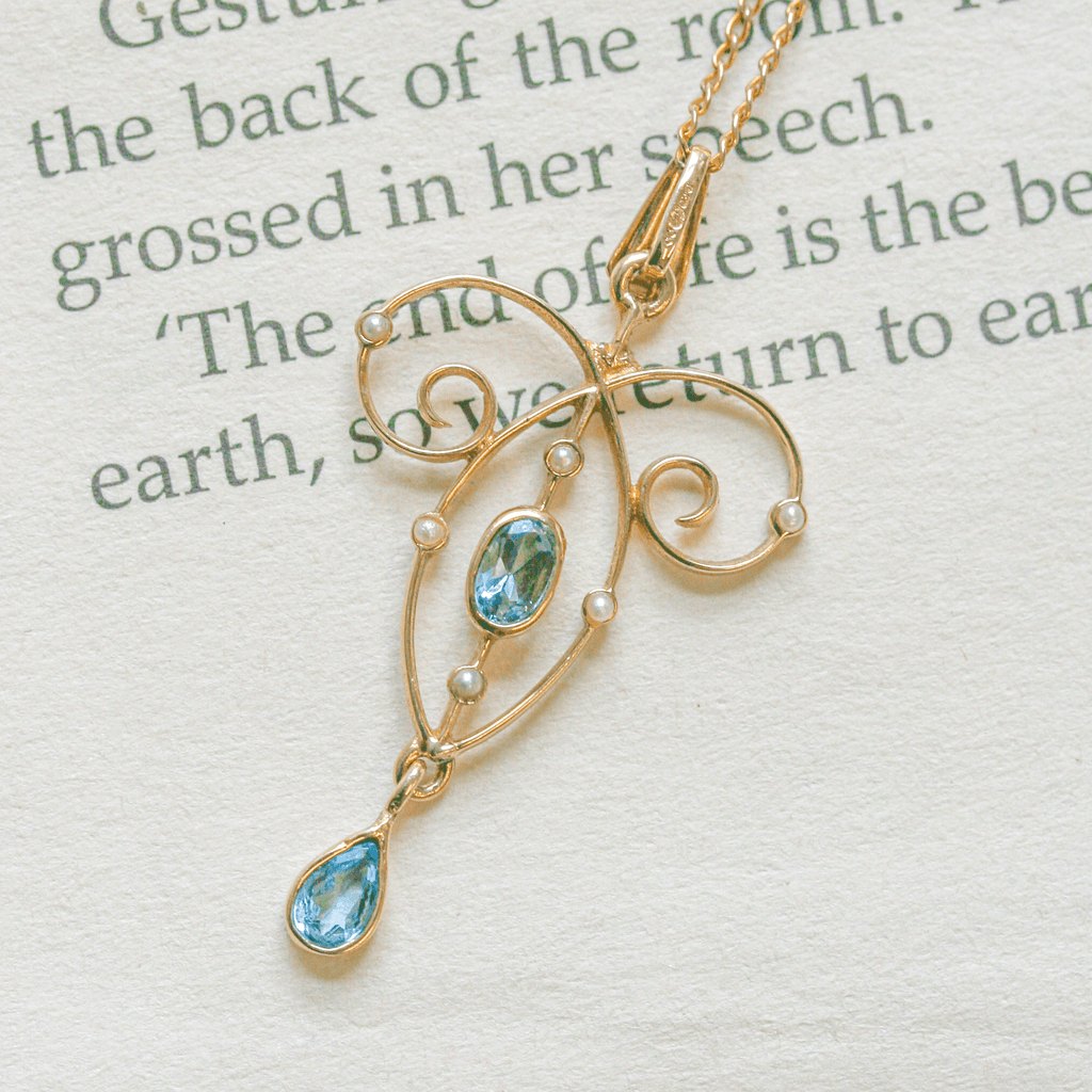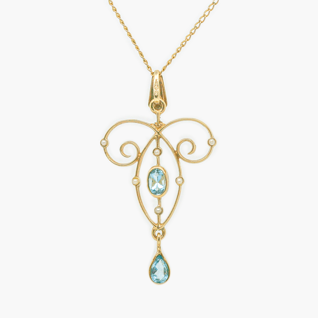 Necklace in 9ct yellow gold with a lavalier pendant decorated with two visually striking aquamarines and six beautiful circular pearls. The pendant is suspended on a yellow gold 16" chain with a spring ring clasp. The pendant and the chain is pre-owned.