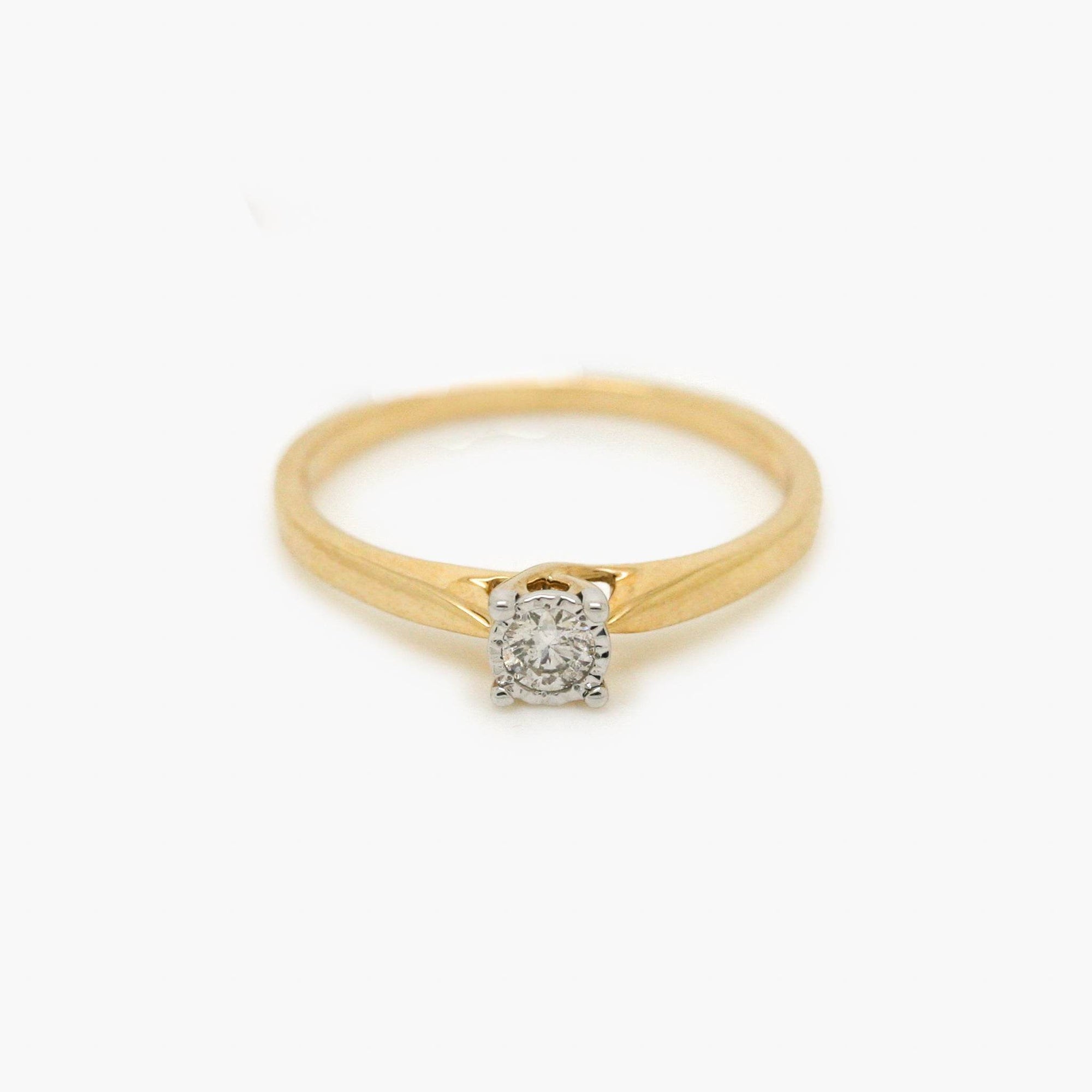 Round 0.13ct diamond set in a white gold miracle head for a larger look. Finished with a tapered 9ct yellow gold band—an elegant engagement ring.
