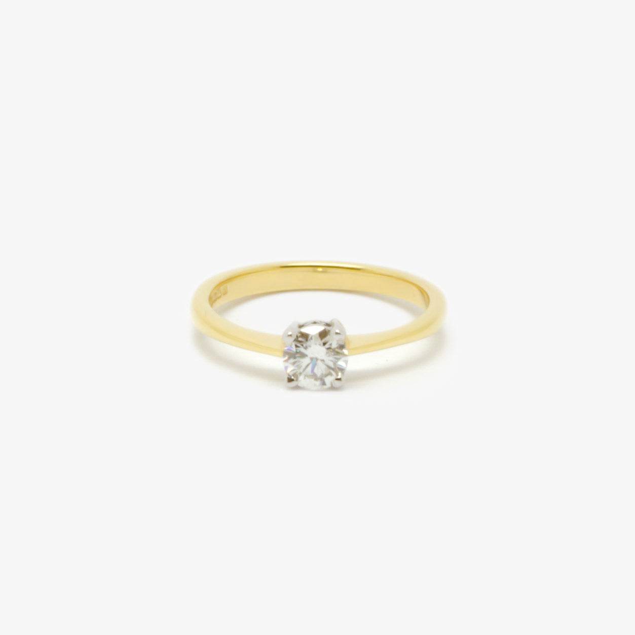 Ring in 18ct yellow gold with a white gold setting that sits a diamond. The diamond carat weight is 0.50ct, colour G and clarity SI1. The diamond solitaire weights 2.8g and ring size N.