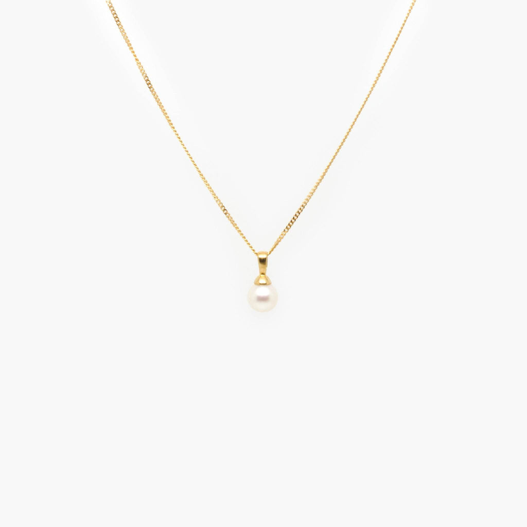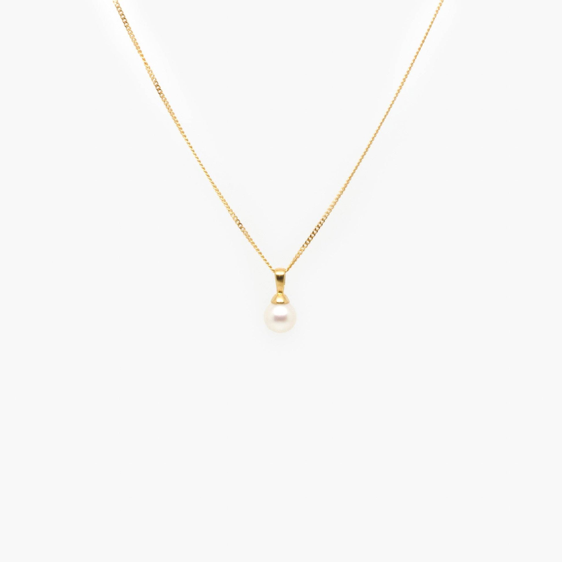 Necklace in 18ct yellow gold with an round 0.8cm Akoya pearl pendant, that is suspended on an 9ct 18" chain with a spring ring clasp. The weight of the necklace is 3.6g.