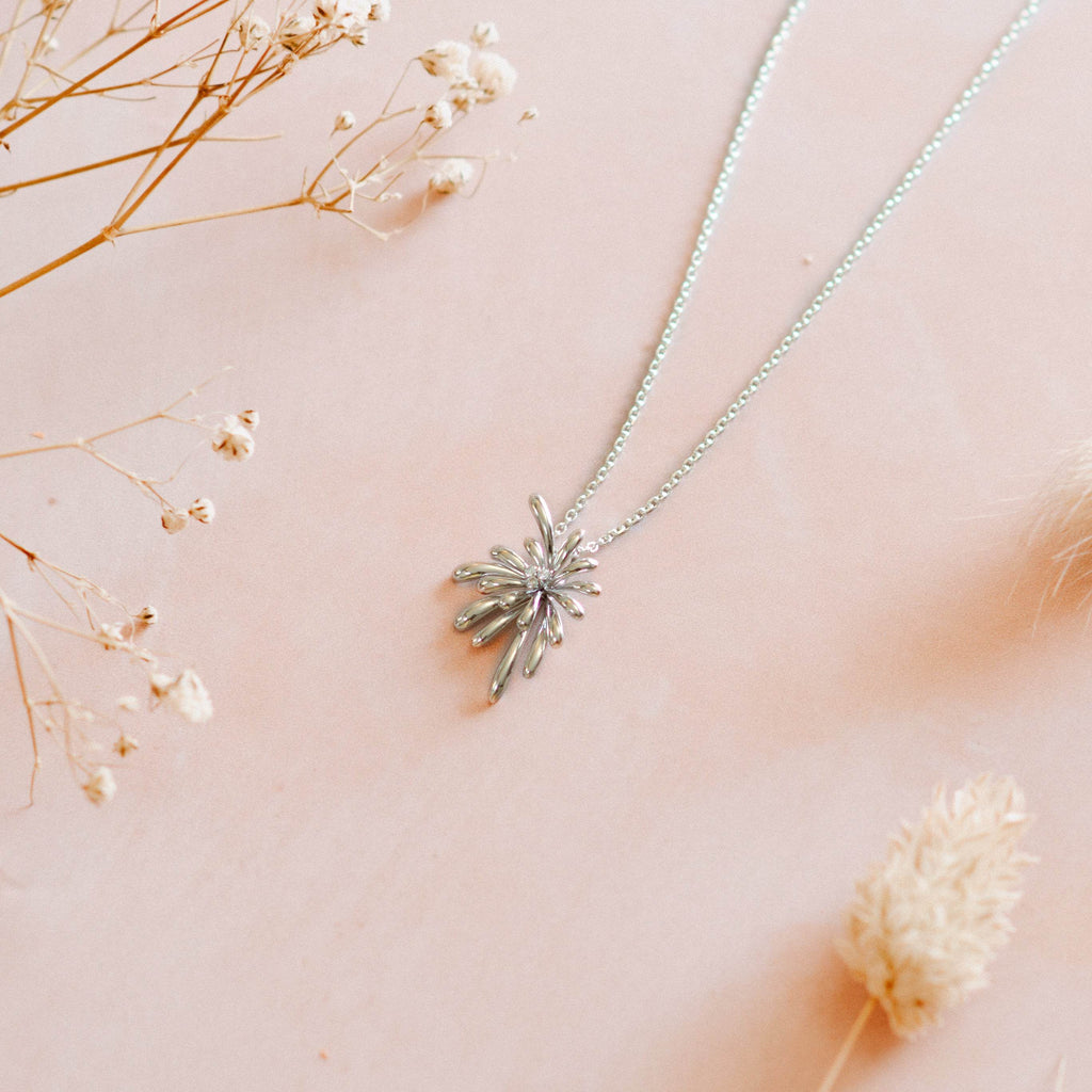 Necklace in silver with a pendant that is 9ct white gold with a design to depict fireworks and three small diamonds in the centre. The pendant is pre-owned and suspended on a 925 silver 16" chain with a spring ring clasp.