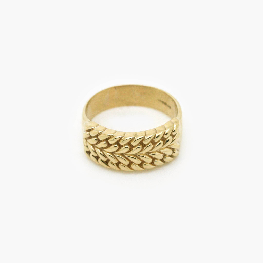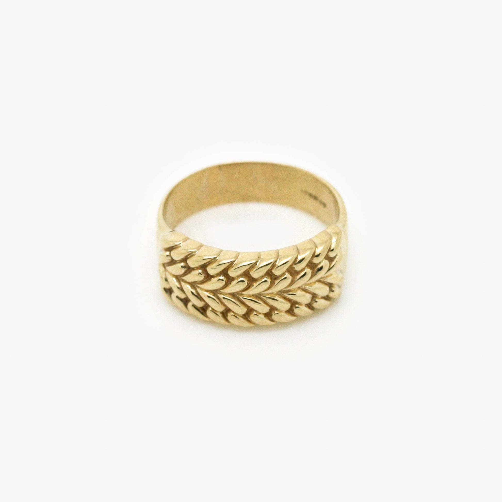 This 9 carat yellow gold keeper ring features are gorgeous, unique design measuring 1cm at it's widest. Pre-owned in great condition, this ring is a size W.