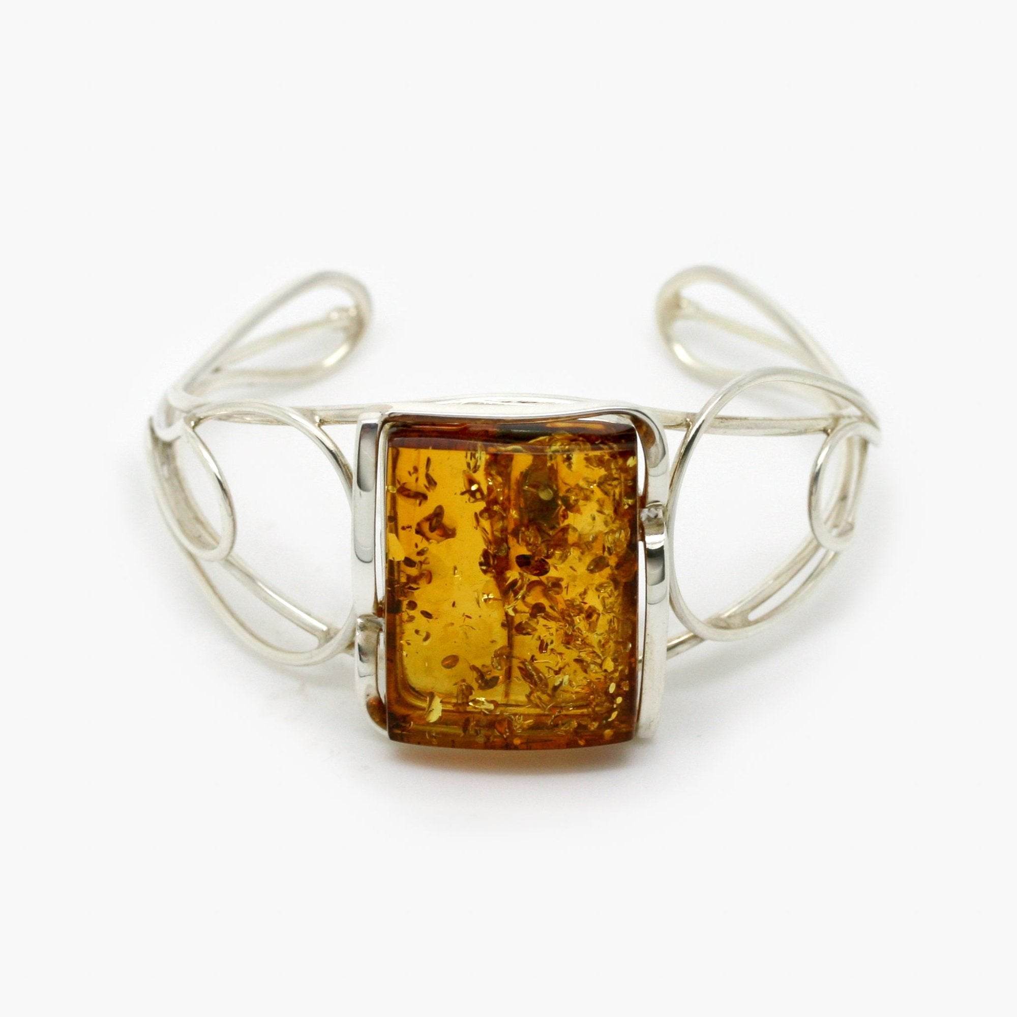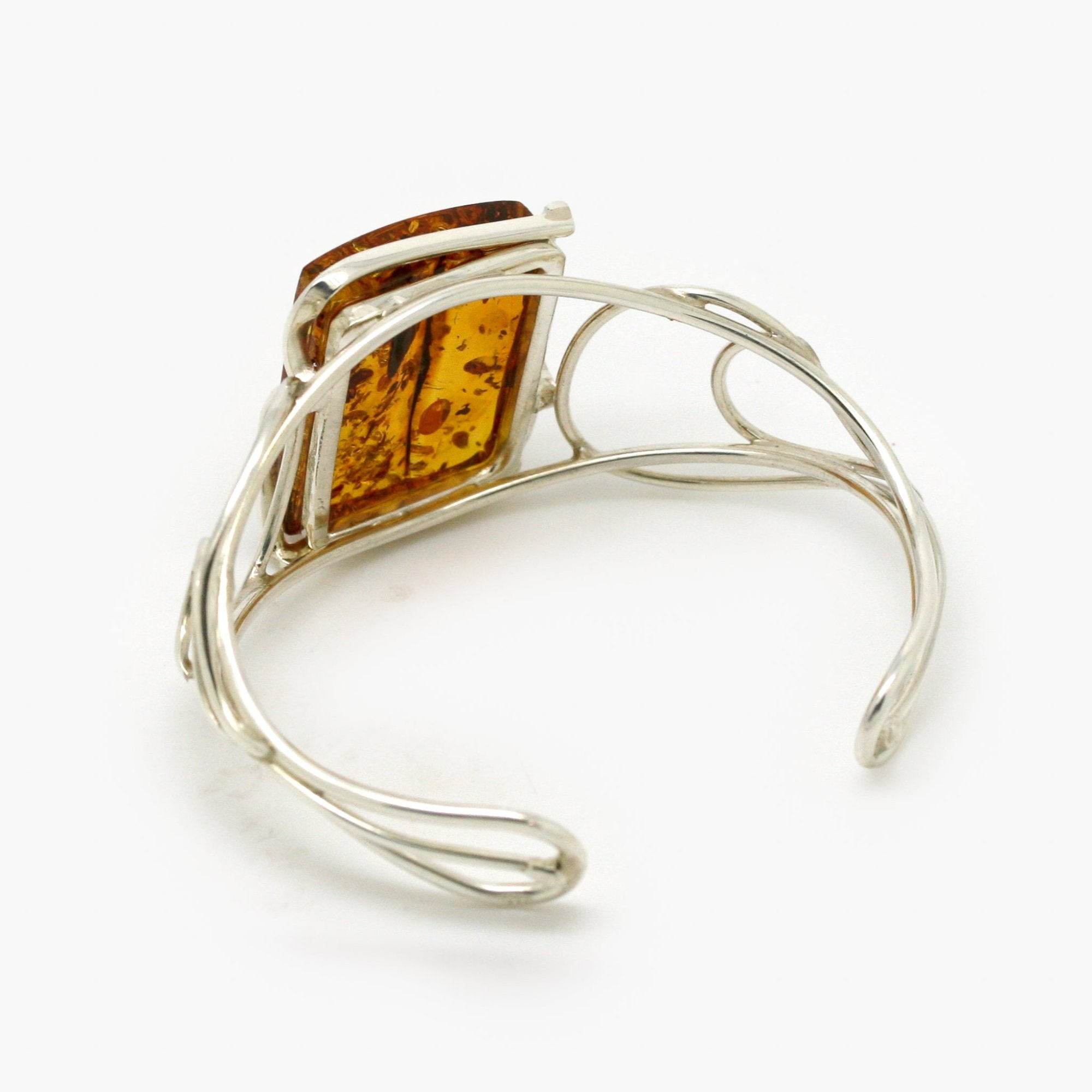 This beautiful piece features an autumnal Baltic amber gemstone in a square shape, sat on an adjustable silver bangle.