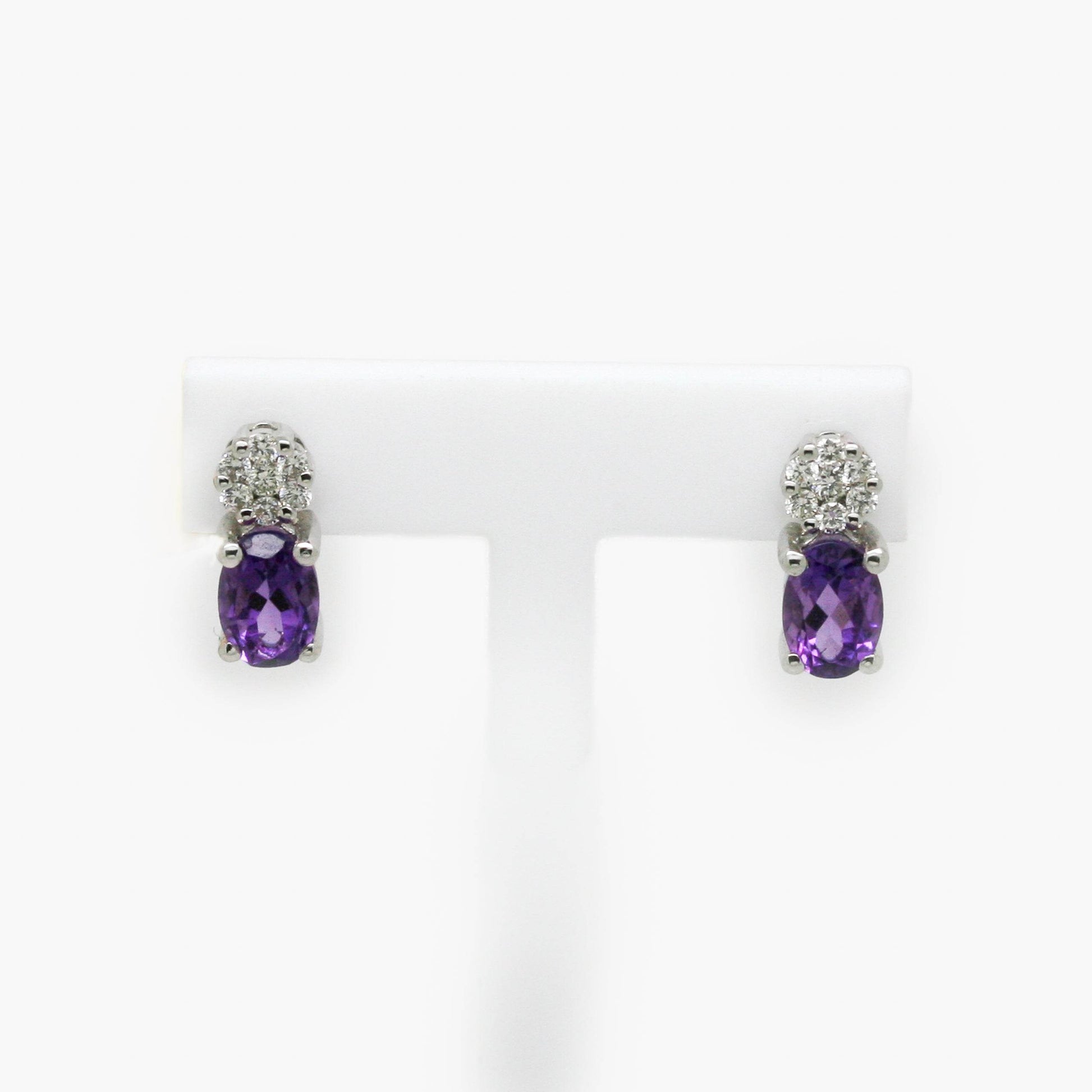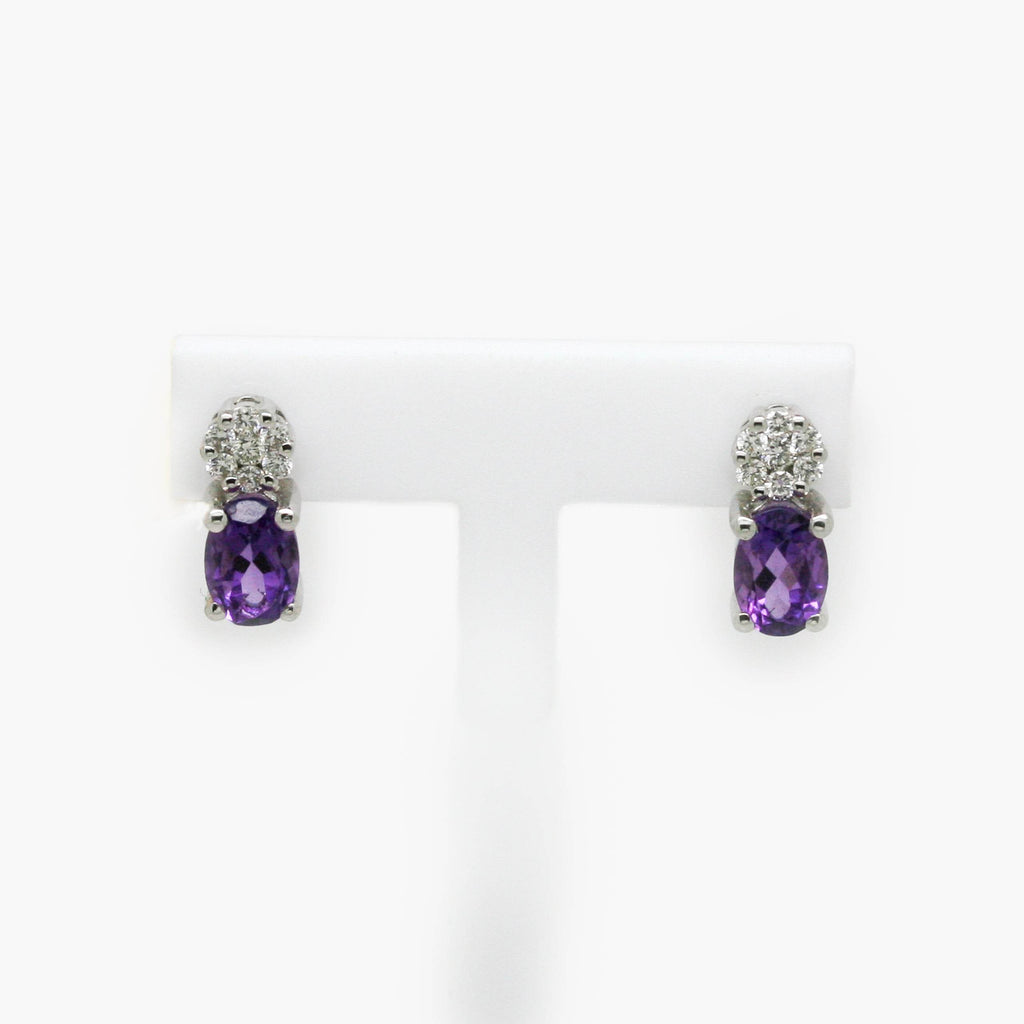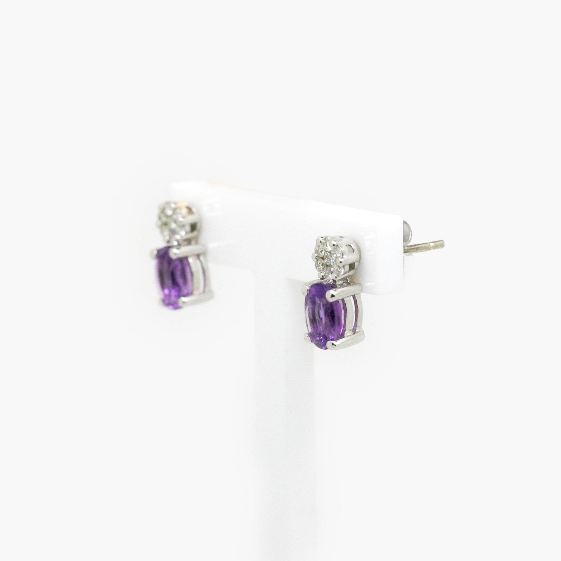 Each earring holds an oval amethyst gemstone with a cluster of 7 diamonds sat just above, both set in 9 carat white gold claw settings.