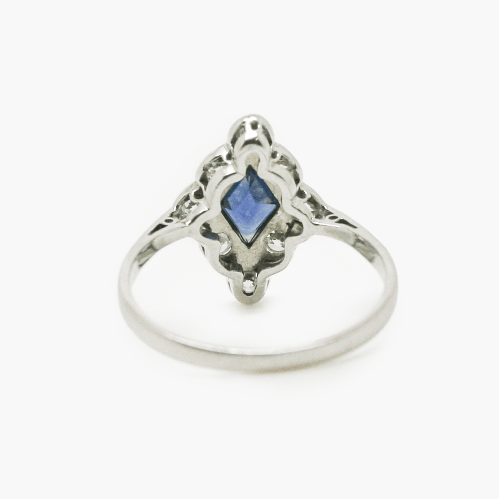 This is an Art Deco style sapphire and diamond ring. The ring is set with a diamond shaped sapphire in the centre and bordered with eight diamonds. The band has been crafted in a platinum setting. This ring is antique and is size Q.