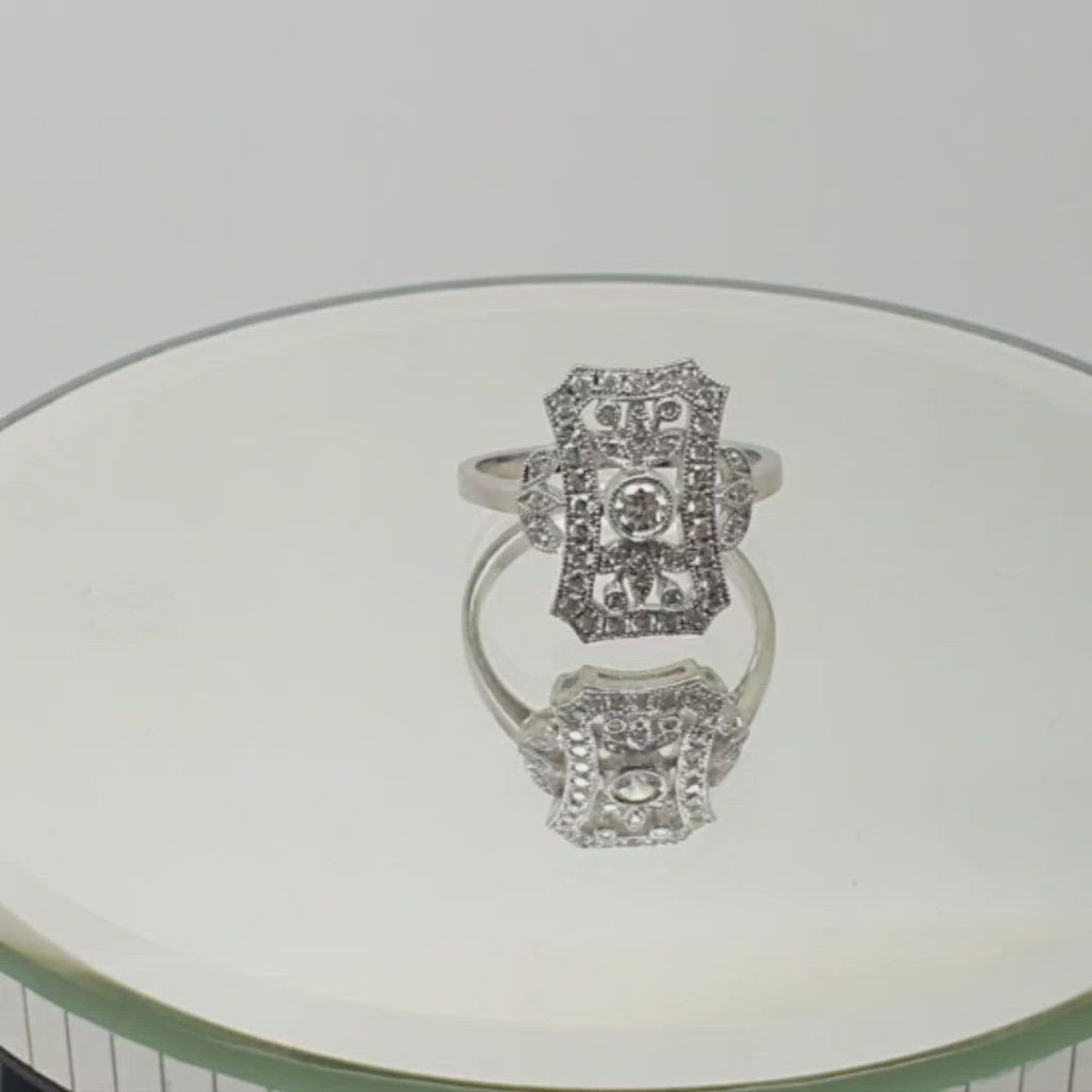 Ring in 18ct white gold with 0.46ct of diamonds. This ring is influenced by the Art Deco era and weighs 4.2g. Ring size M.