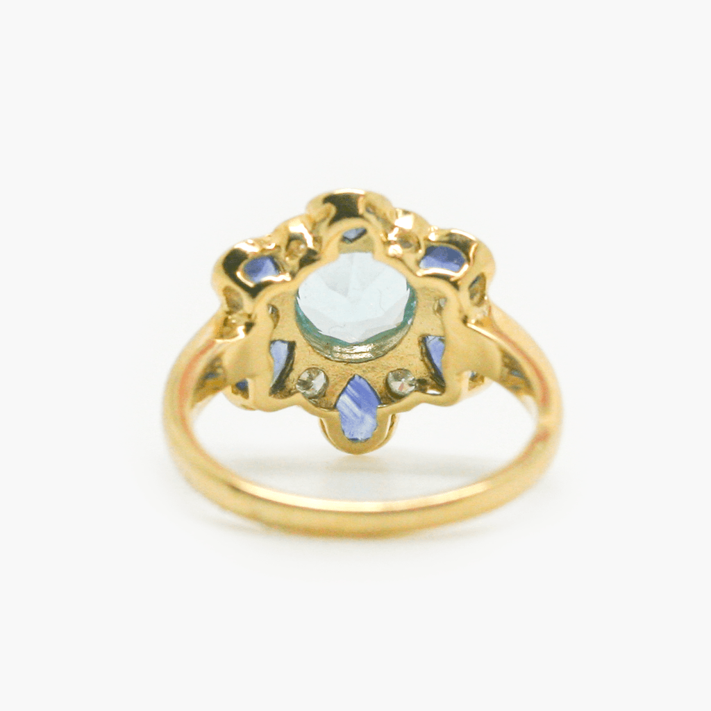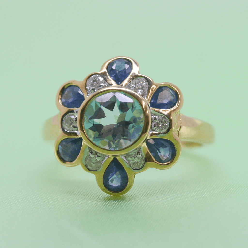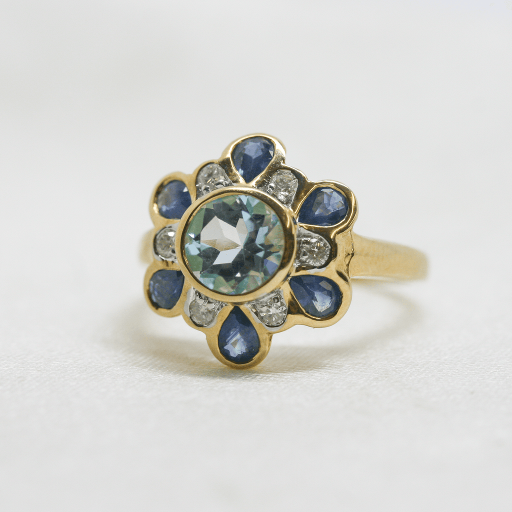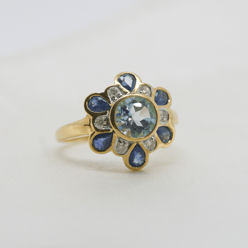 New 9 Carat Yellow Gold Blue Topaz, Sapphire and Diamond Flower Ring - Jordans Jewellers