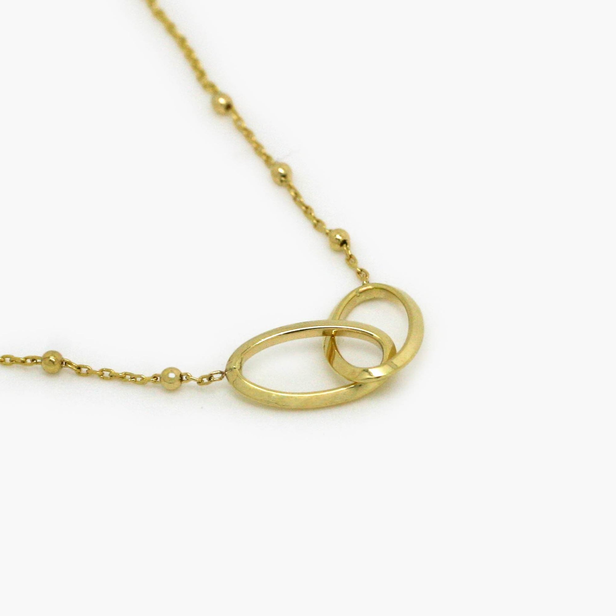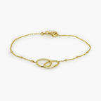 Delicate 9ct gold bracelet featuring two interlocking links on a fine beaded chain. A simple, modern piece suited for everyday wear.