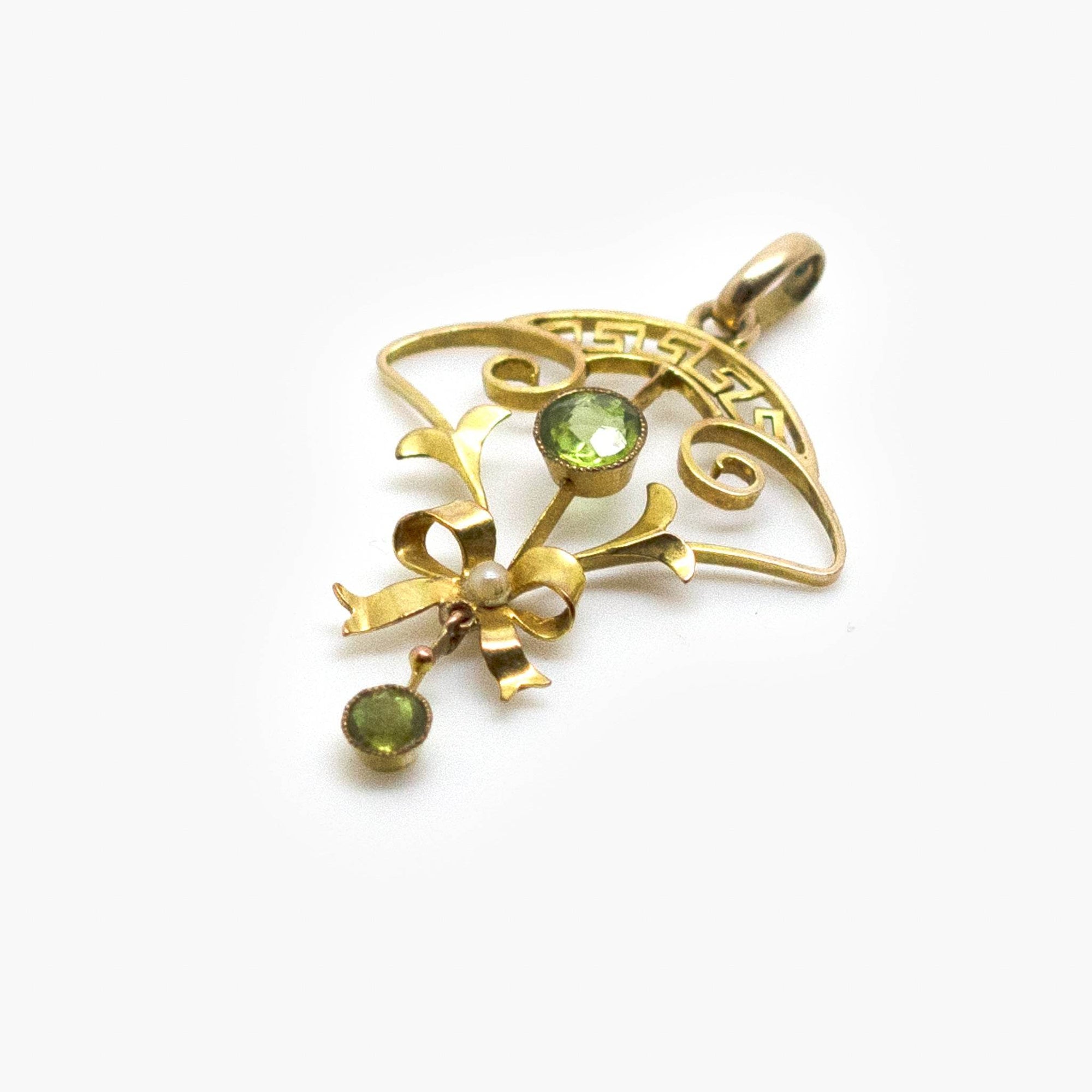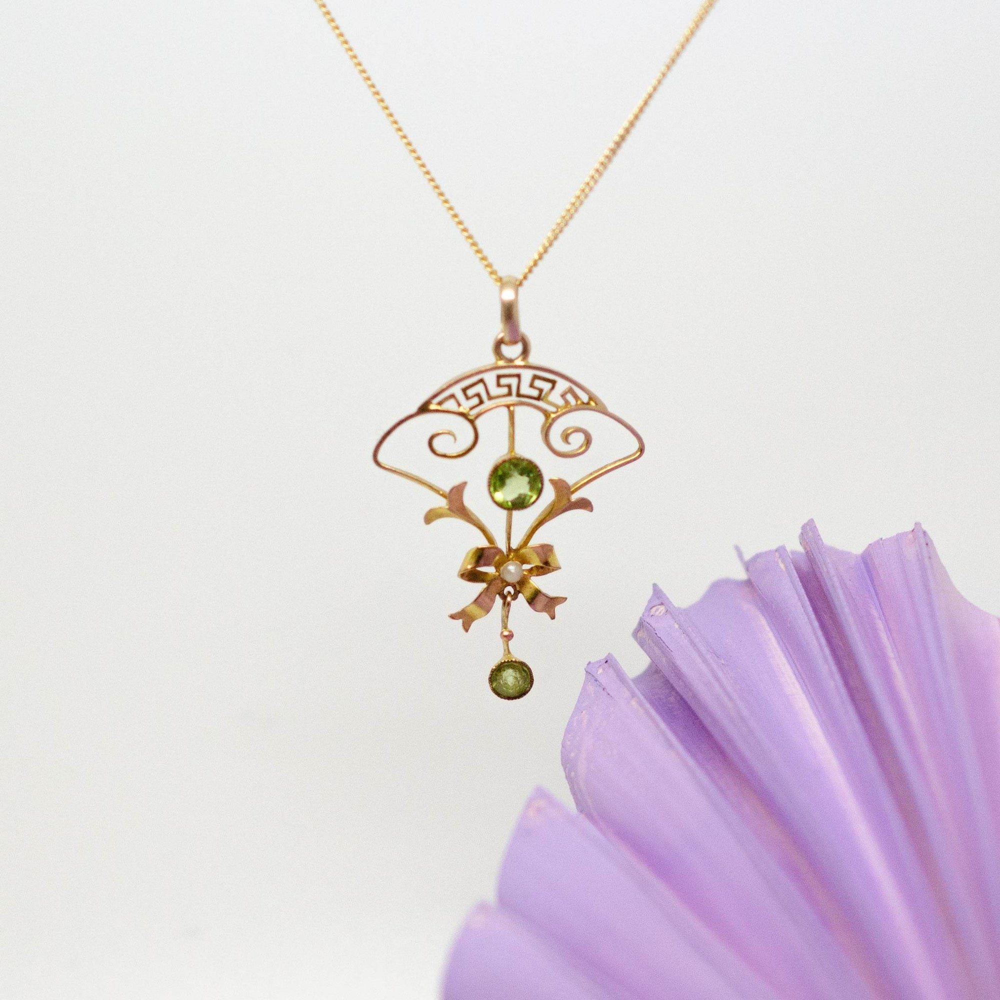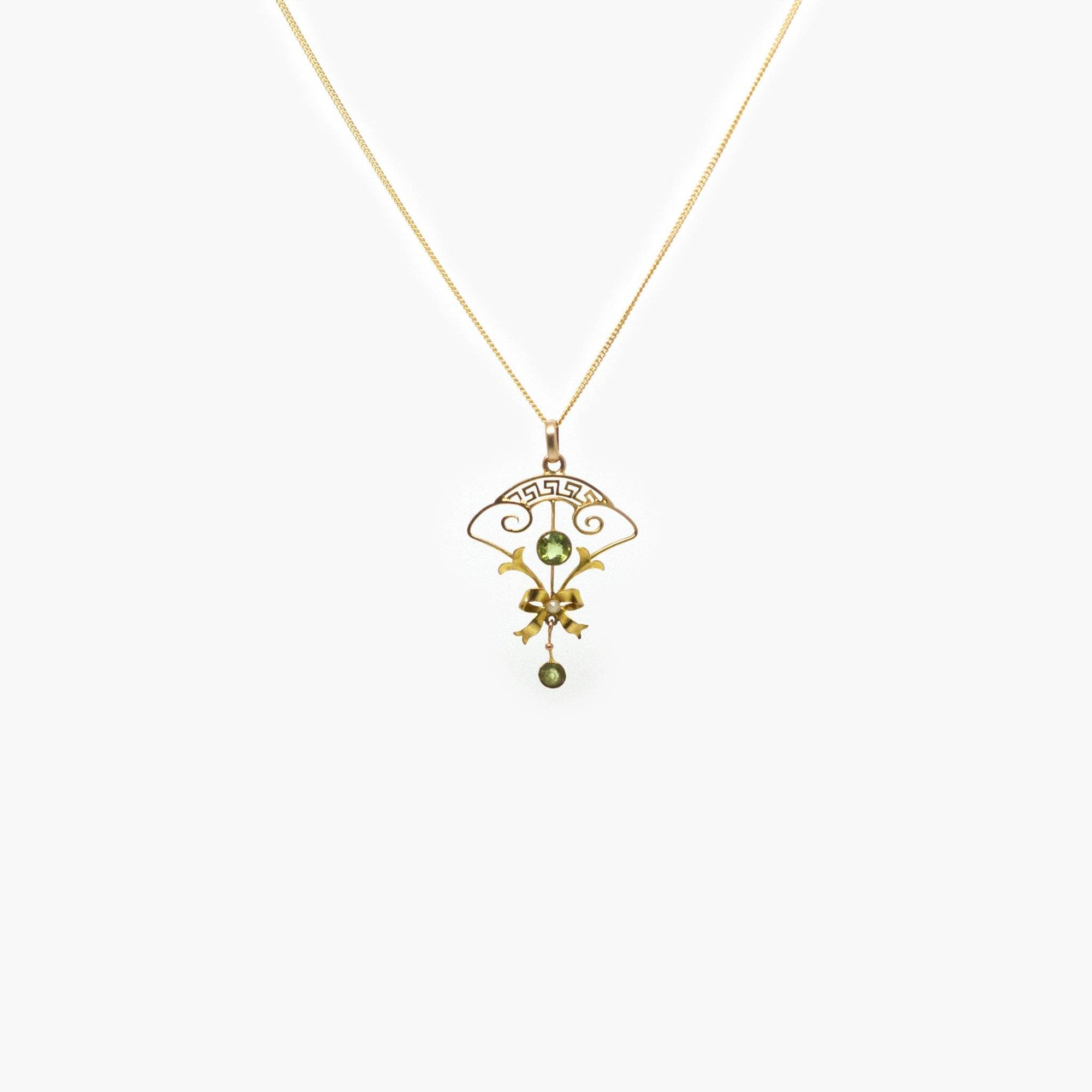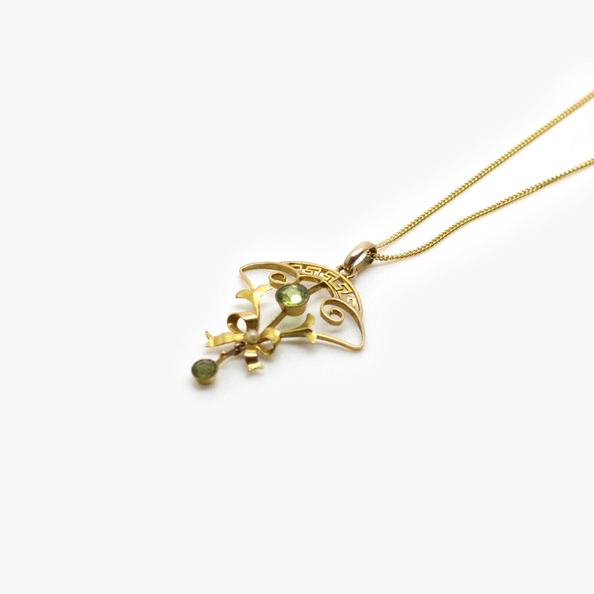 Necklace in 9ct yellow gold. The pendant is an early 20th century green peridot and seed pearl pedant stamped '9ct.' The pendant weighs a total of 1.5g, length is 3.6cm and width 2.4cm. The pendant is pre-owned Art Nouveau style, but the chain it is suspended from is new. The chain is a 16" 9ct yellow gold chain with a spring ring clasp.