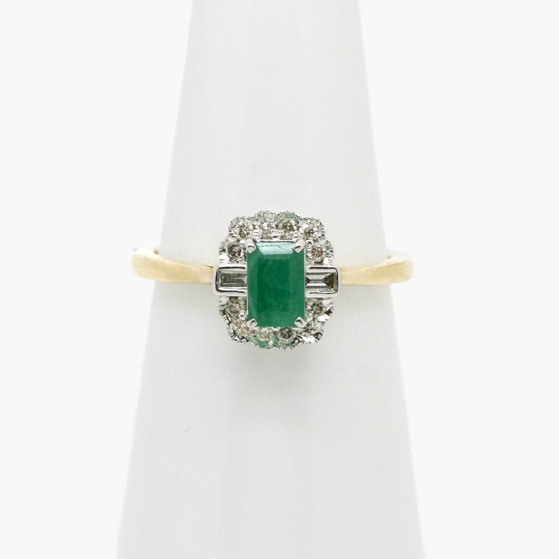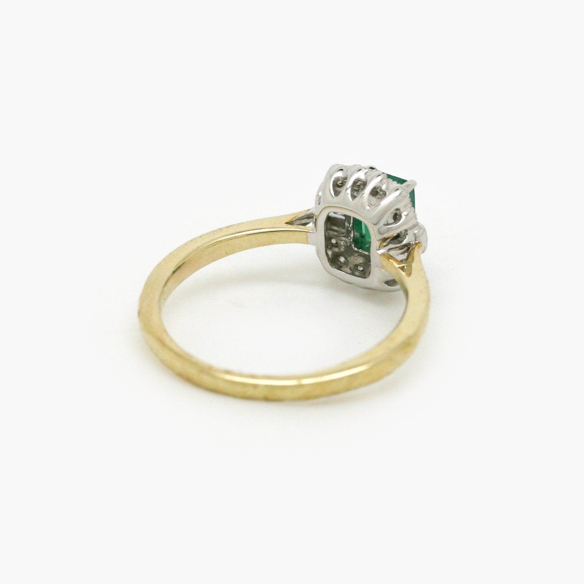 This lovely ring features an emerald cut emerald gemstone weighing 0.60ct, surrounded by an intricate design of 0.20ct of diamonds. Set in 9ct white gold on a 9ct yellow gold shank.