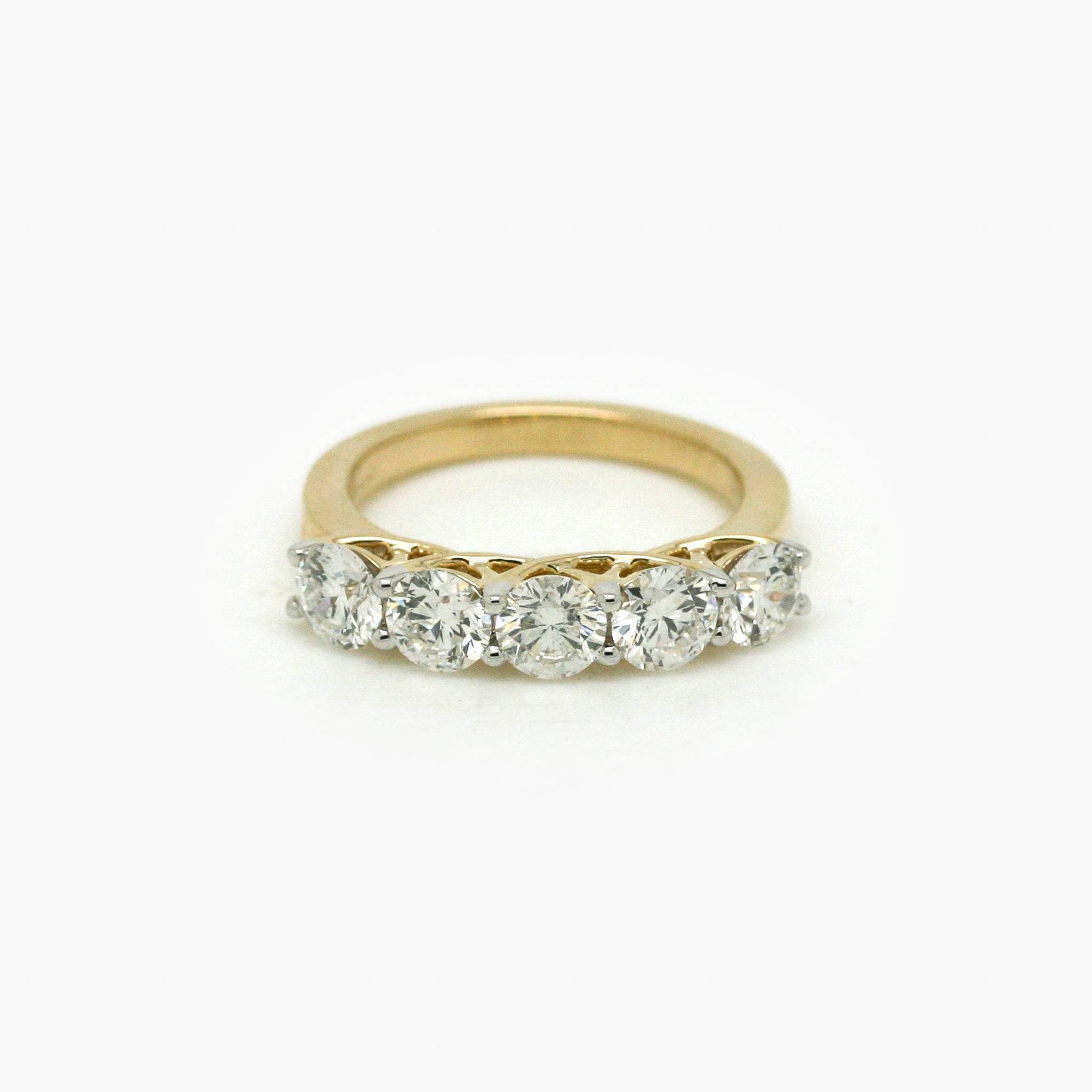 This beautiful ring features 5 diamond gemstones in a secure 9 carat yellow gold scallop claw setting, sitting on a lovely 9 carat yellow gold band. The diamond weight is 2.04 carat and the ring is a size N.
