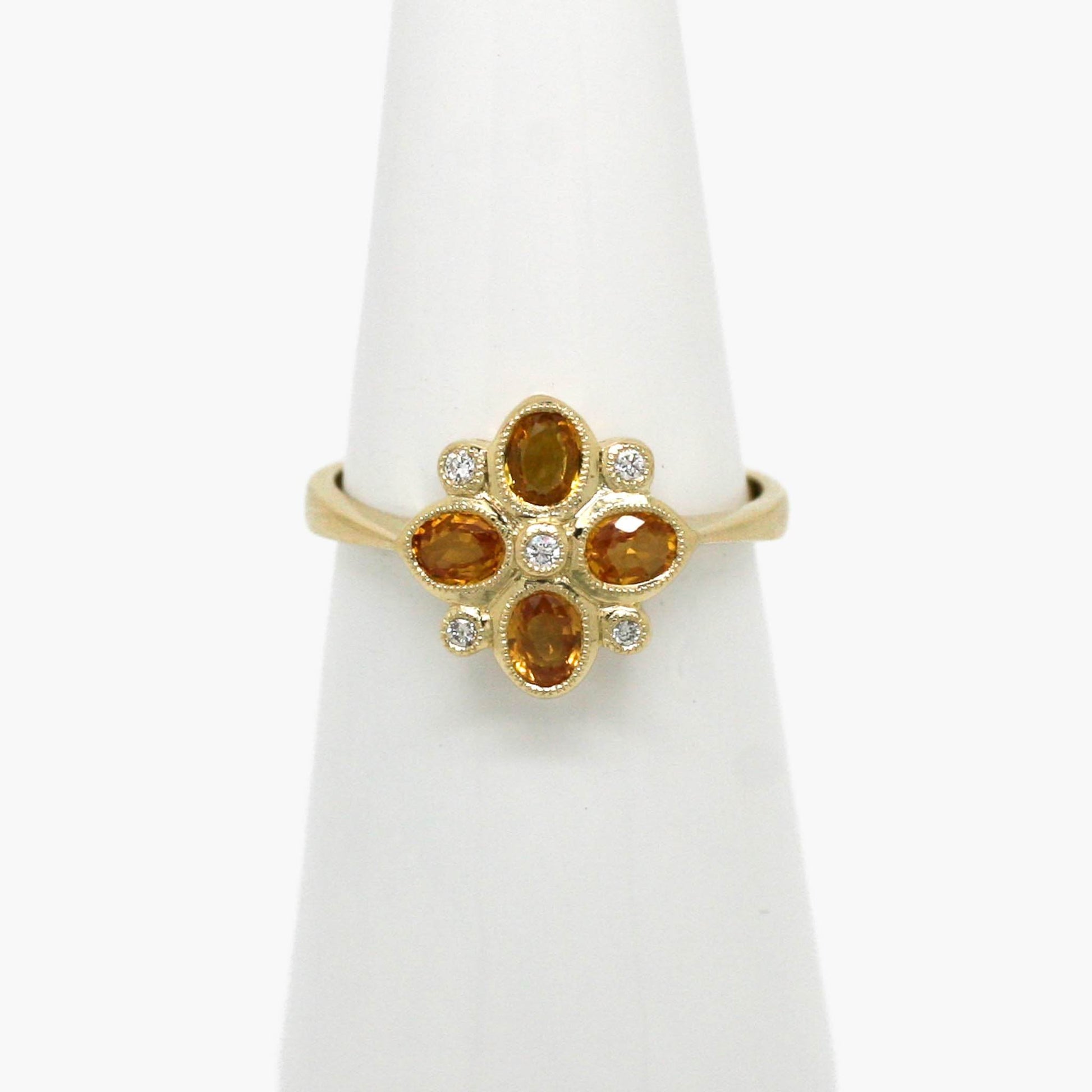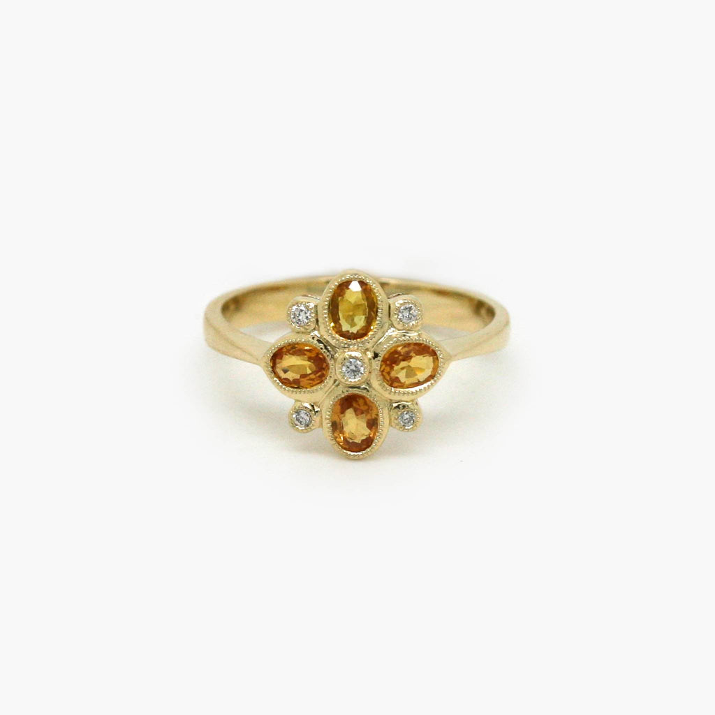 This 9ct yellow gold ring features four rich citrines with 0.05ct diamonds in a floral-inspired cluster. A bright, elegant piece perfect for everyday luxury.