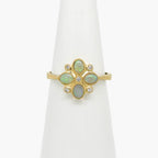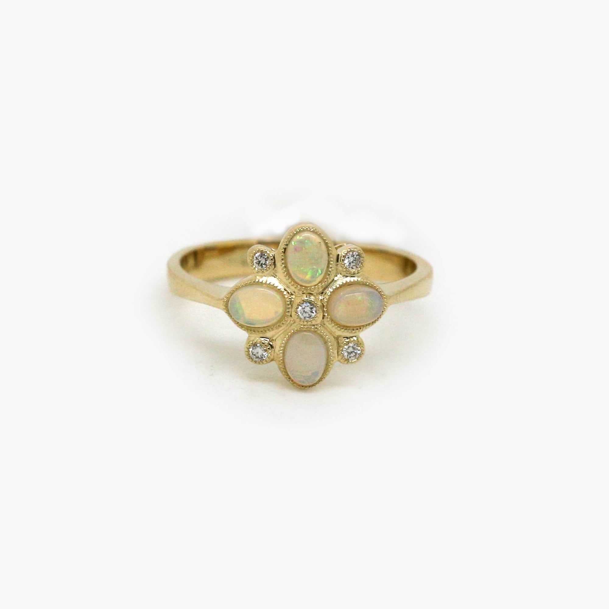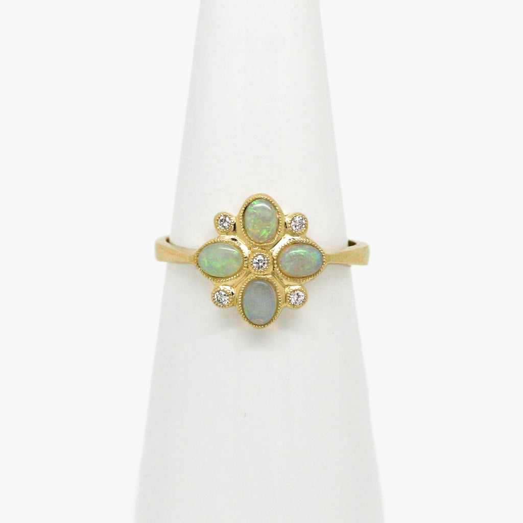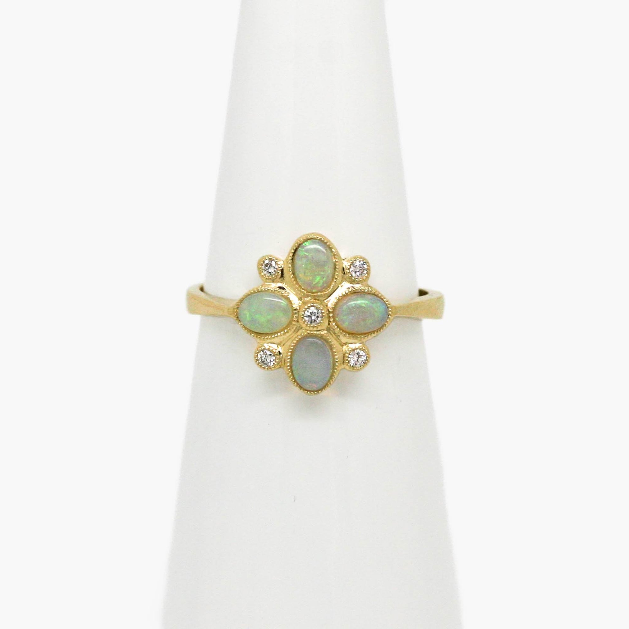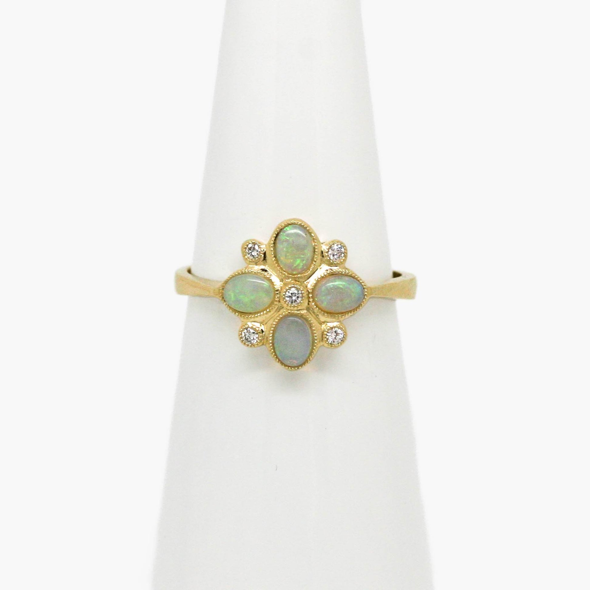 This 9ct gold ring features four glowing opals and 0.05ct of diamonds in a floral cluster. A beautifully balanced piece full of colour, charm and elegance.