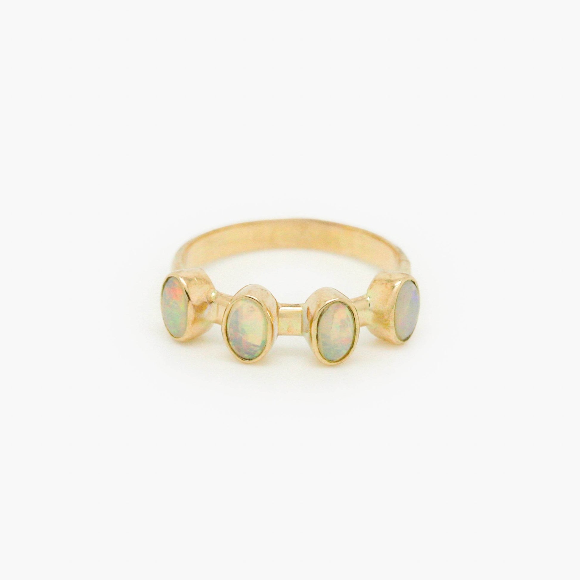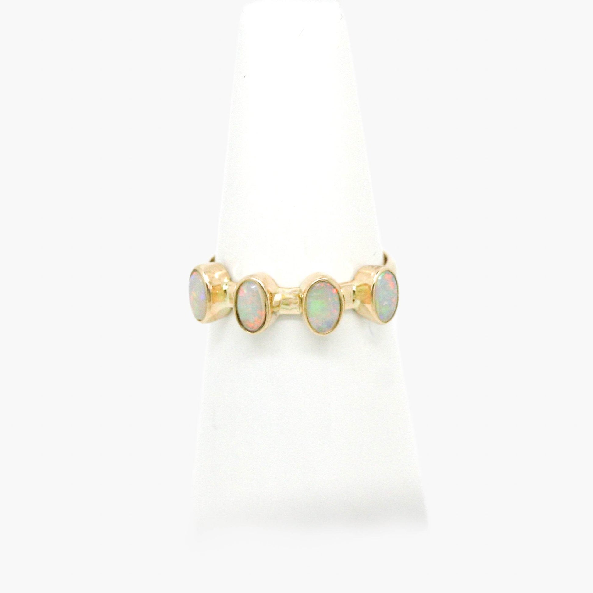 This ring holds four oval shaped opal stones each with a gap in between, set in 9 carat yellow gold. The ring is a size M 1/2 - enquire for resizing.