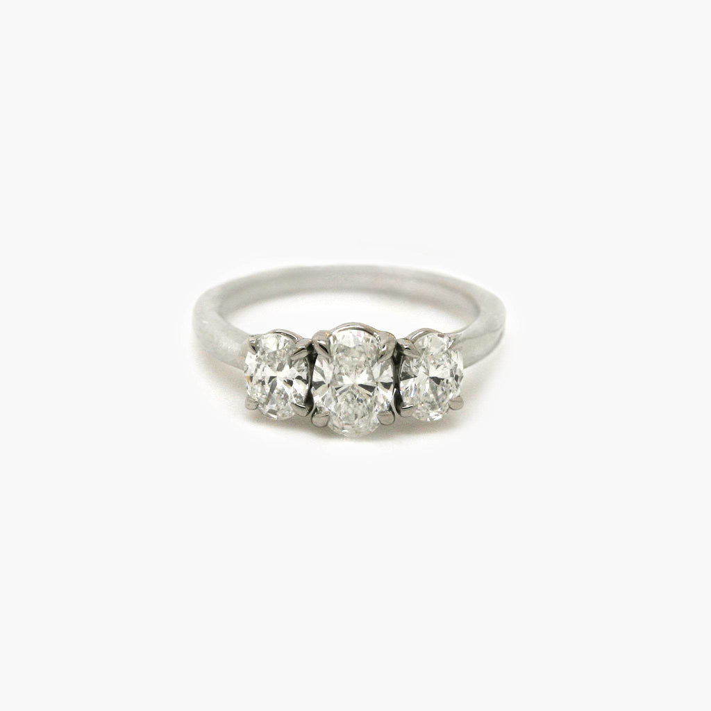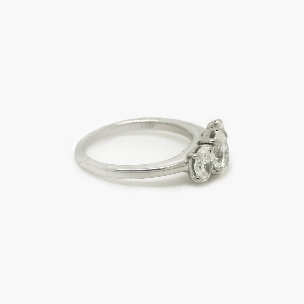 A timeless platinum three stone ring showcasing 1.50ct of oval-cut diamonds. Elegant and symbolic, perfect for engagements or anniversaries with lasting brilliance.