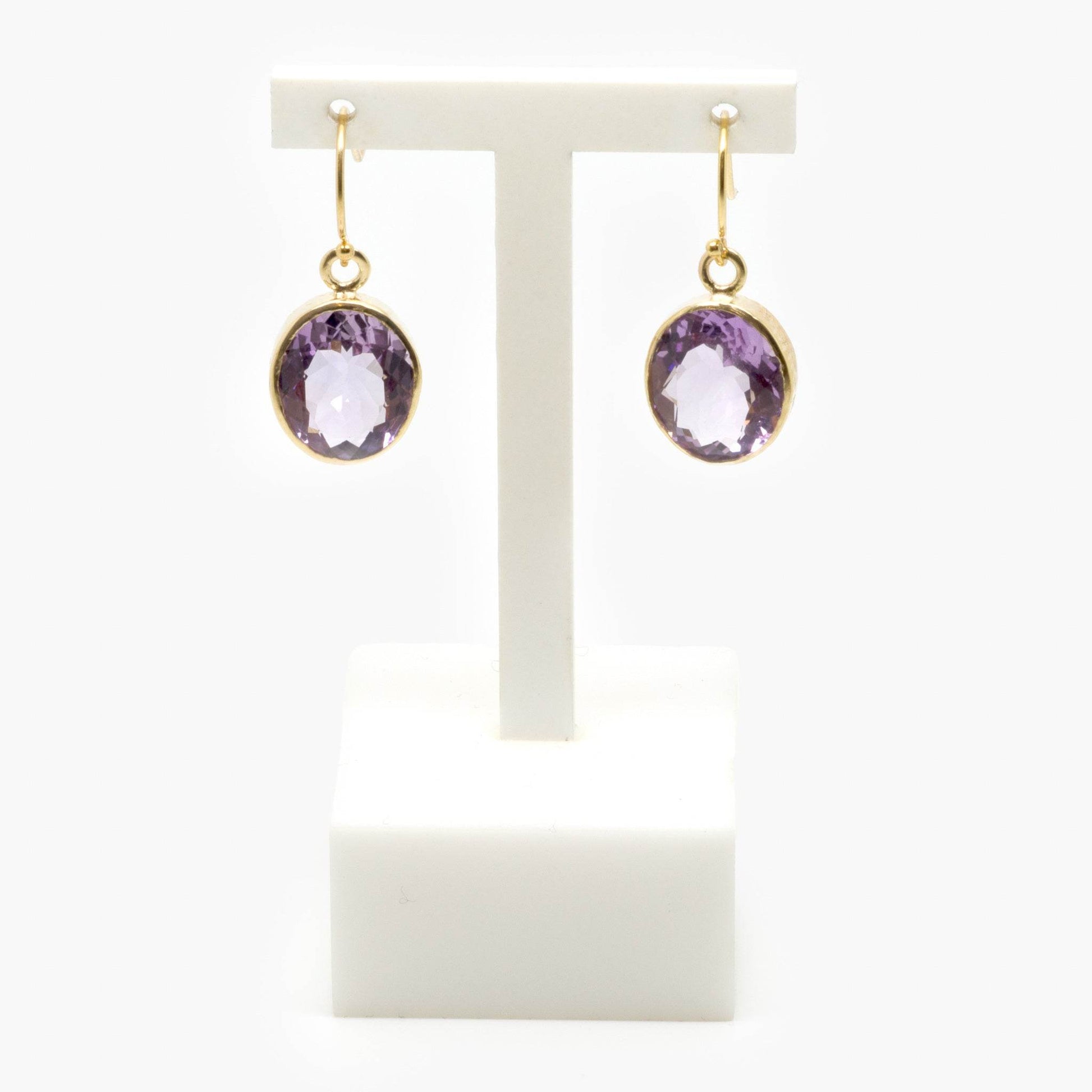Earrings in rolled gold, stamped 925. The oval purple lavender coloured quartz drops are suspended on hooks. The weight of the earrings is 6.7g and the estimated drop length 3.1cm.
