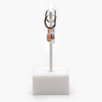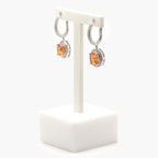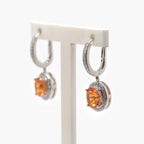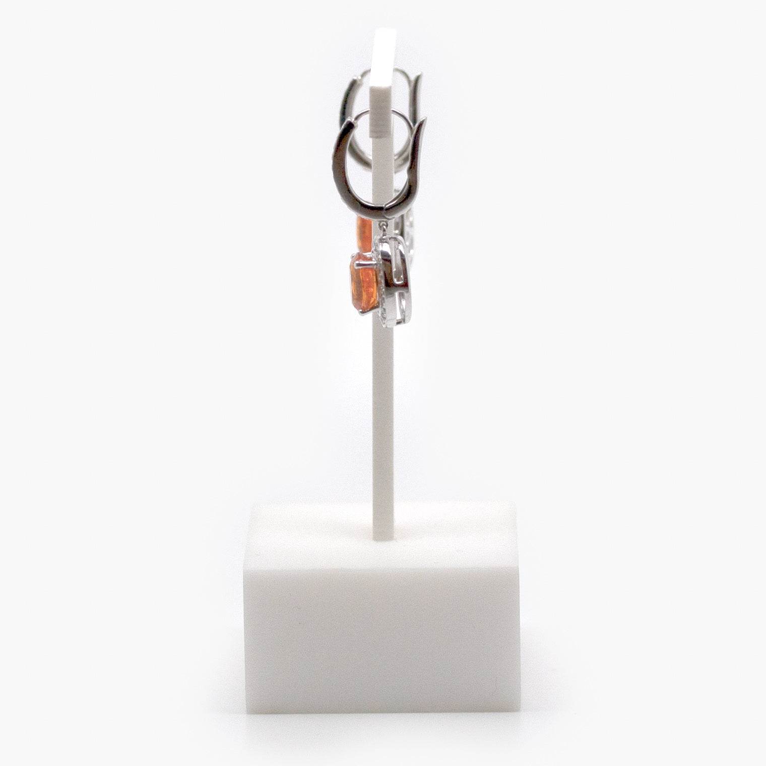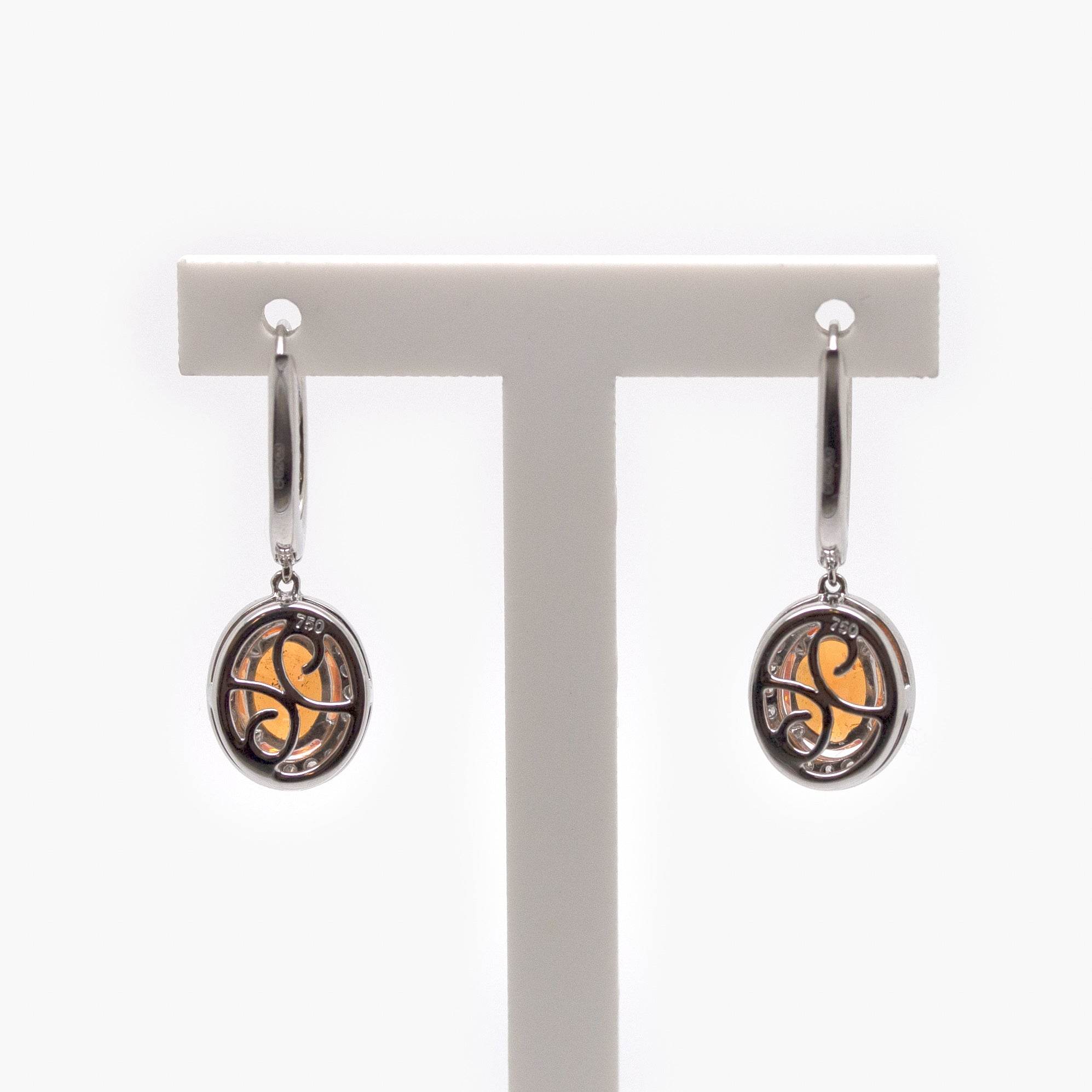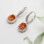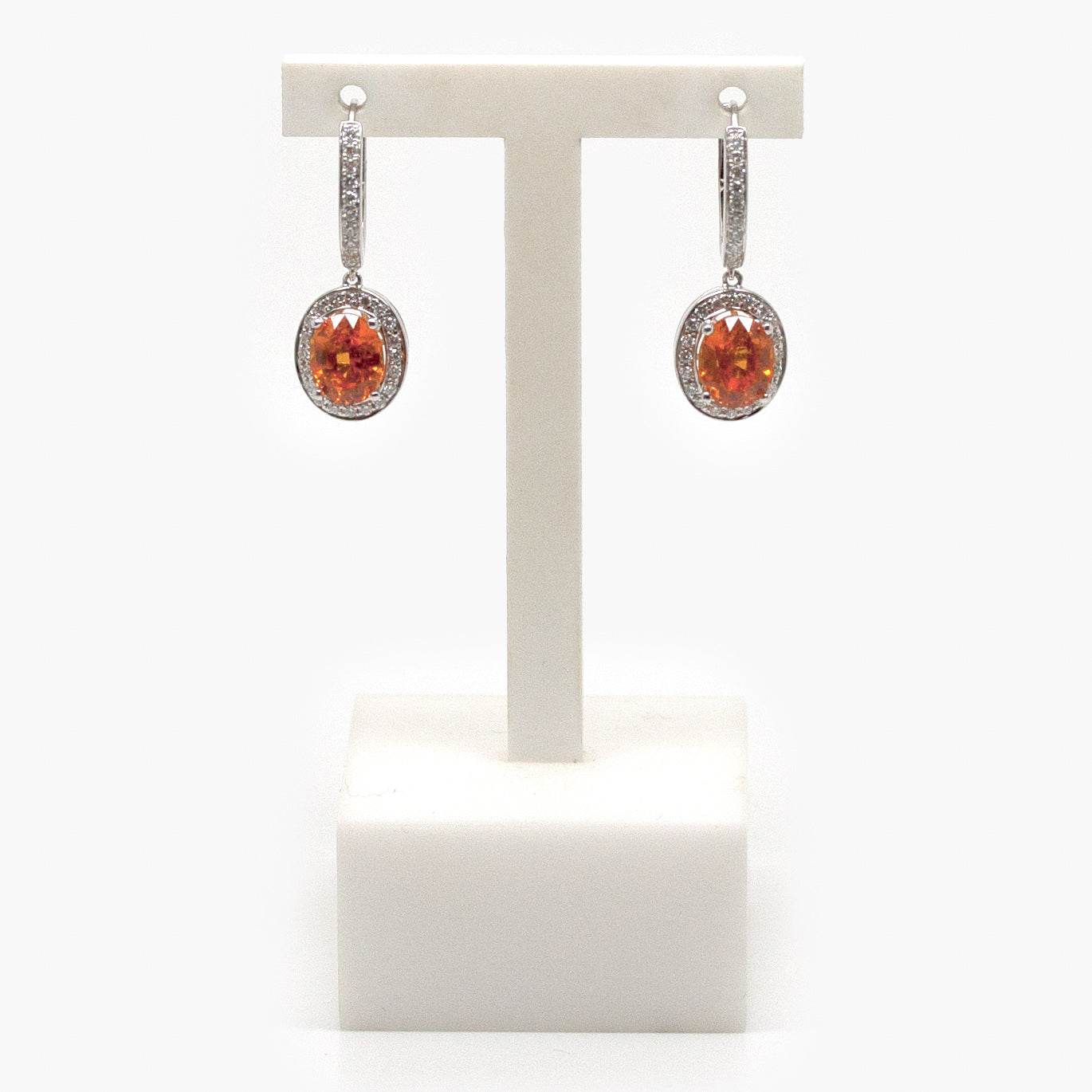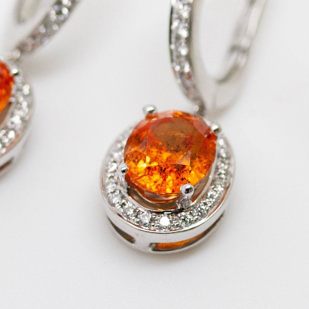Earrings in 18ct white gold with an oval mandarin orange garnet gemstone surrounded by a halo of diamonds and continental backings. The carat weight of the oval mandarin garnet is 4.37ct and measures 0.81x0.62x0.5cm. The total carat weight of the diamonds is 0.45ct, diamond colour G and diamond clarity SI1. The earrings weigh a total of 6.6g and the drop length is starting from the top of the line of diamonds 2.7cm. This is a bespoke piece where we originally had gemstones and made it into a pair of drop earrings.