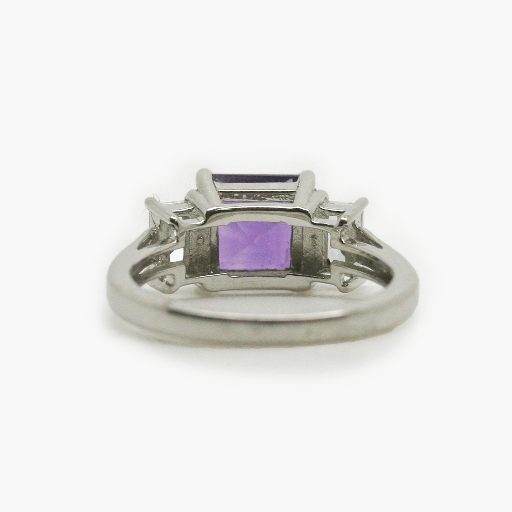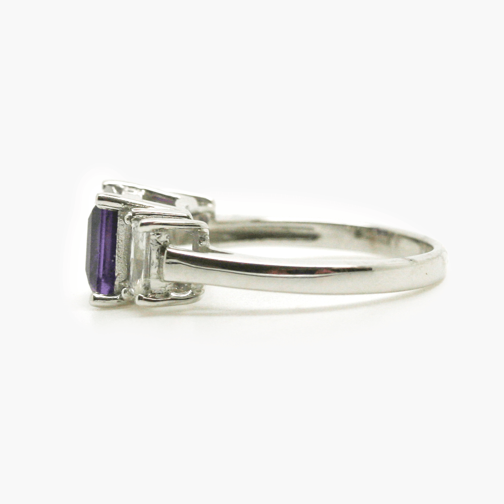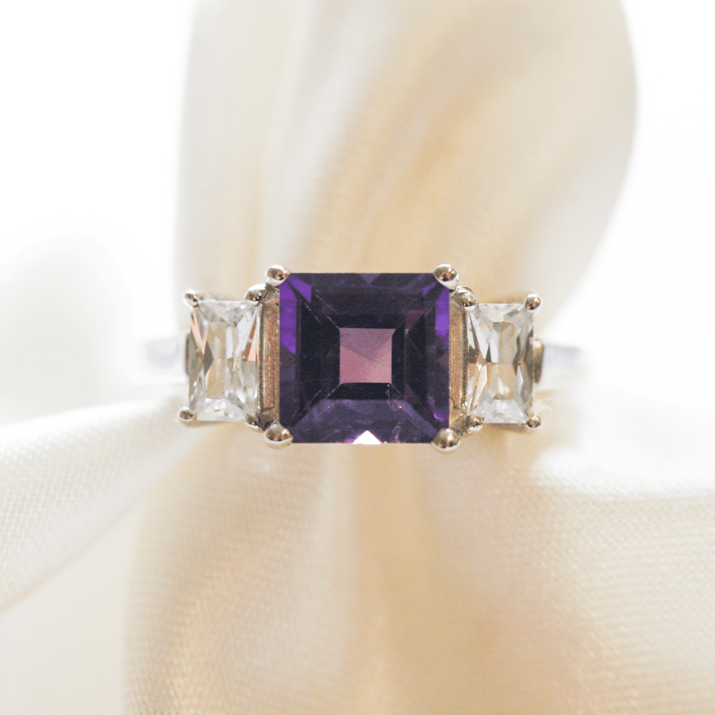 Ring set in 9ct white gold with a purple amethyst gemstone sitting in the centre of the ring and two cubic zirconias sit on either side of the amethyst. The ring size is M.