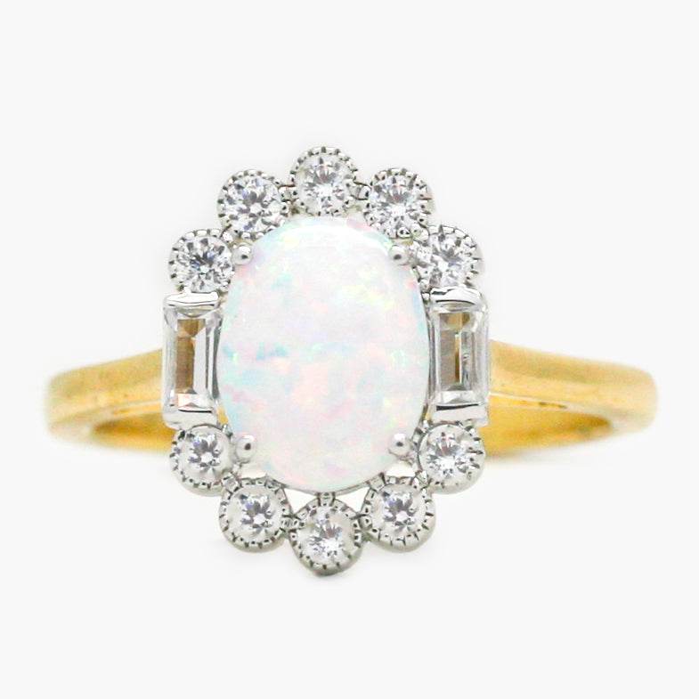 Indulge in ethereal beauty with our NEW 9 Carat Yellow Gold Created Opal & CZ Ring. Crafted to captivate, its shimmering opal centrepiece is complemented by sparkling CZ accents. Perfect for adding a touch of elegance to any ensemble.