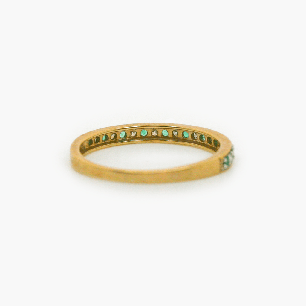 Lush and sparkling emeralds are combined with white diamonds. Crafted in 9ct Yellow Gold, this classic emerald half eternity band is a luxurious and timeless beauty. This is a new ring and is a size N.
