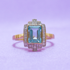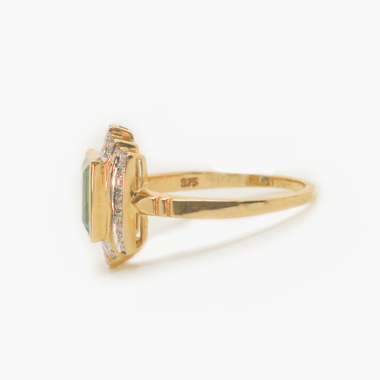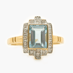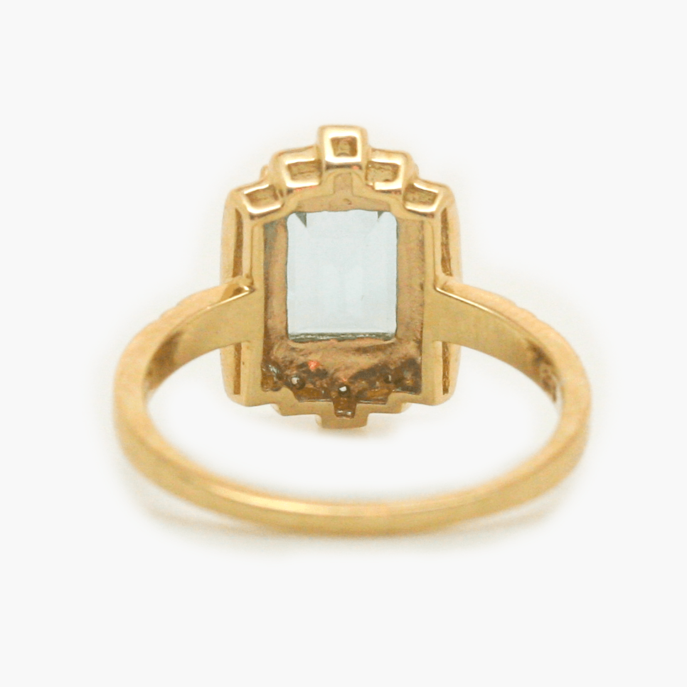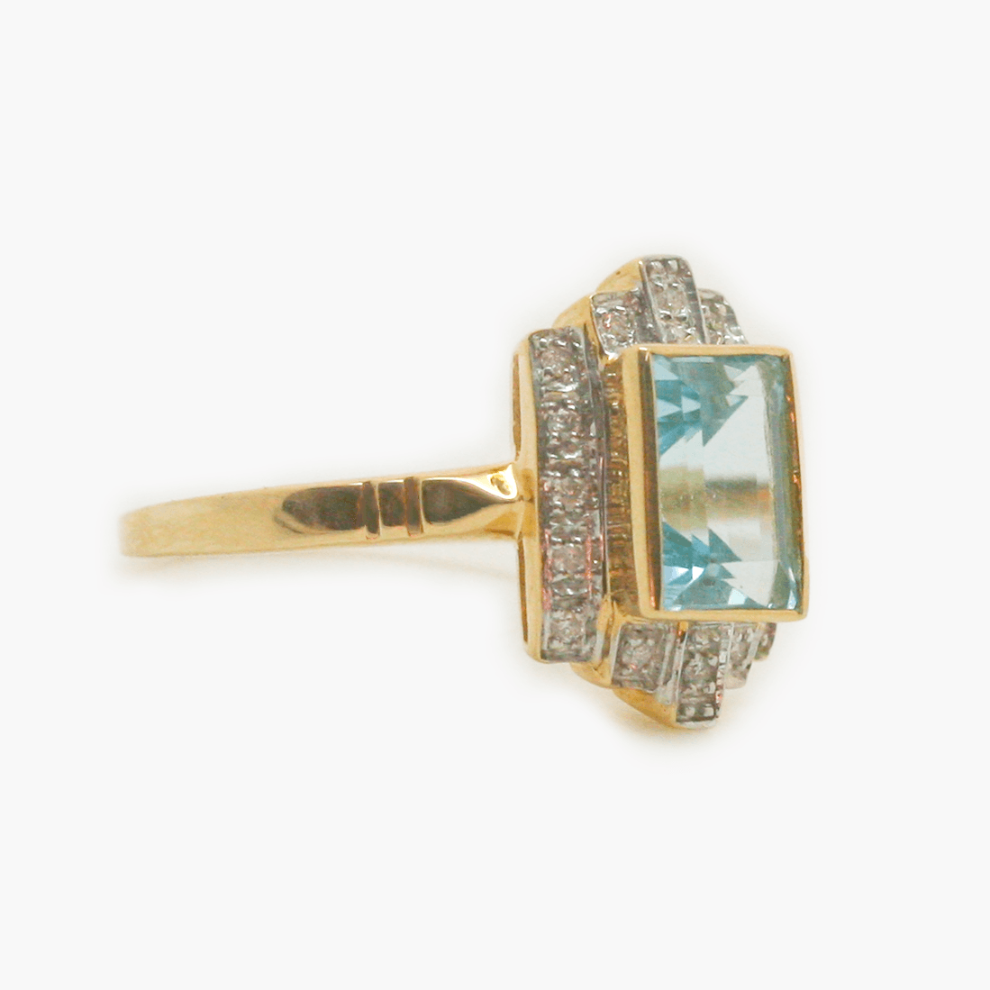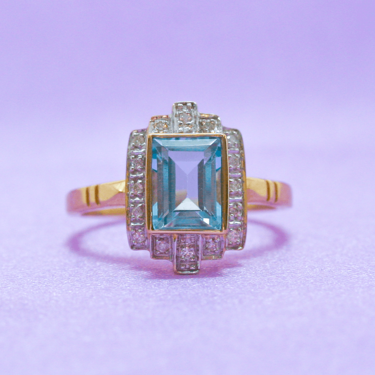 Ring in 9ct yellow gold stamped 375. This ring has a emerald cut sparkly blue topaz centre with decorative diamond sides. Ring size N.