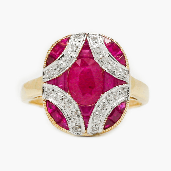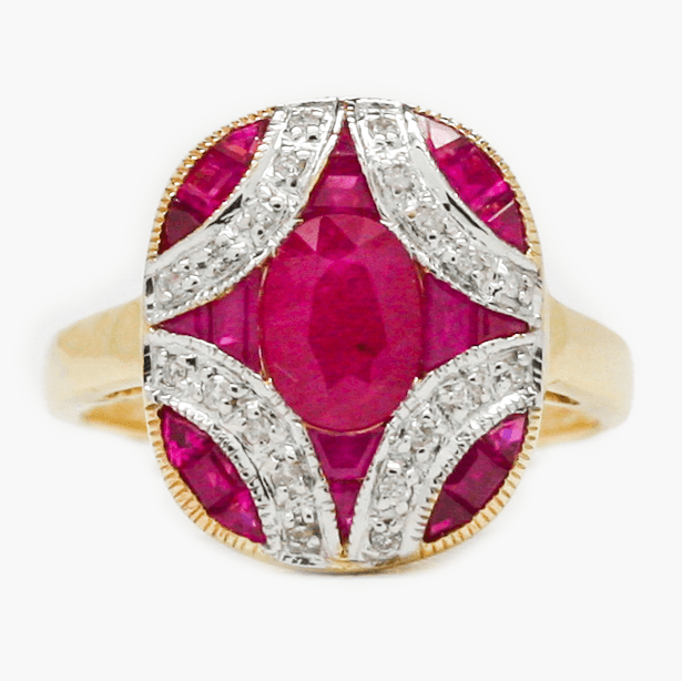 ✨💍 Elevate your style with our stunning Art Deco-inspired NEW Diamond & Ruby 9 Carat Yellow Gold Ring! 💎🌹 This exquisite piece combines the timeless allure of diamonds with the vibrant elegance of rubies, set in lustrous yellow gold. Perfect for adding a touch of glamour to any occasion, this ring is a true statement of sophistication and luxury. Treat yourself or someone special to this dazzling masterpiece today! ✨🎁