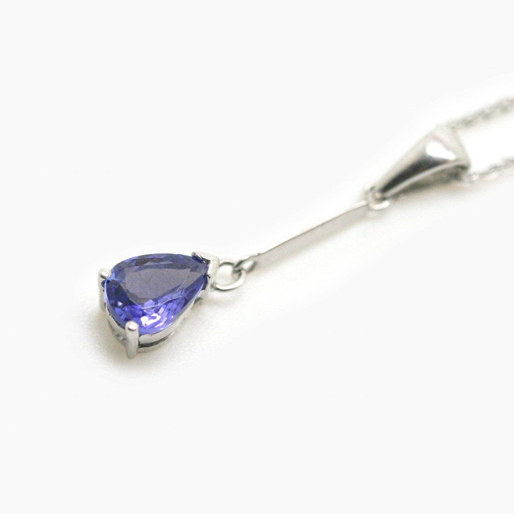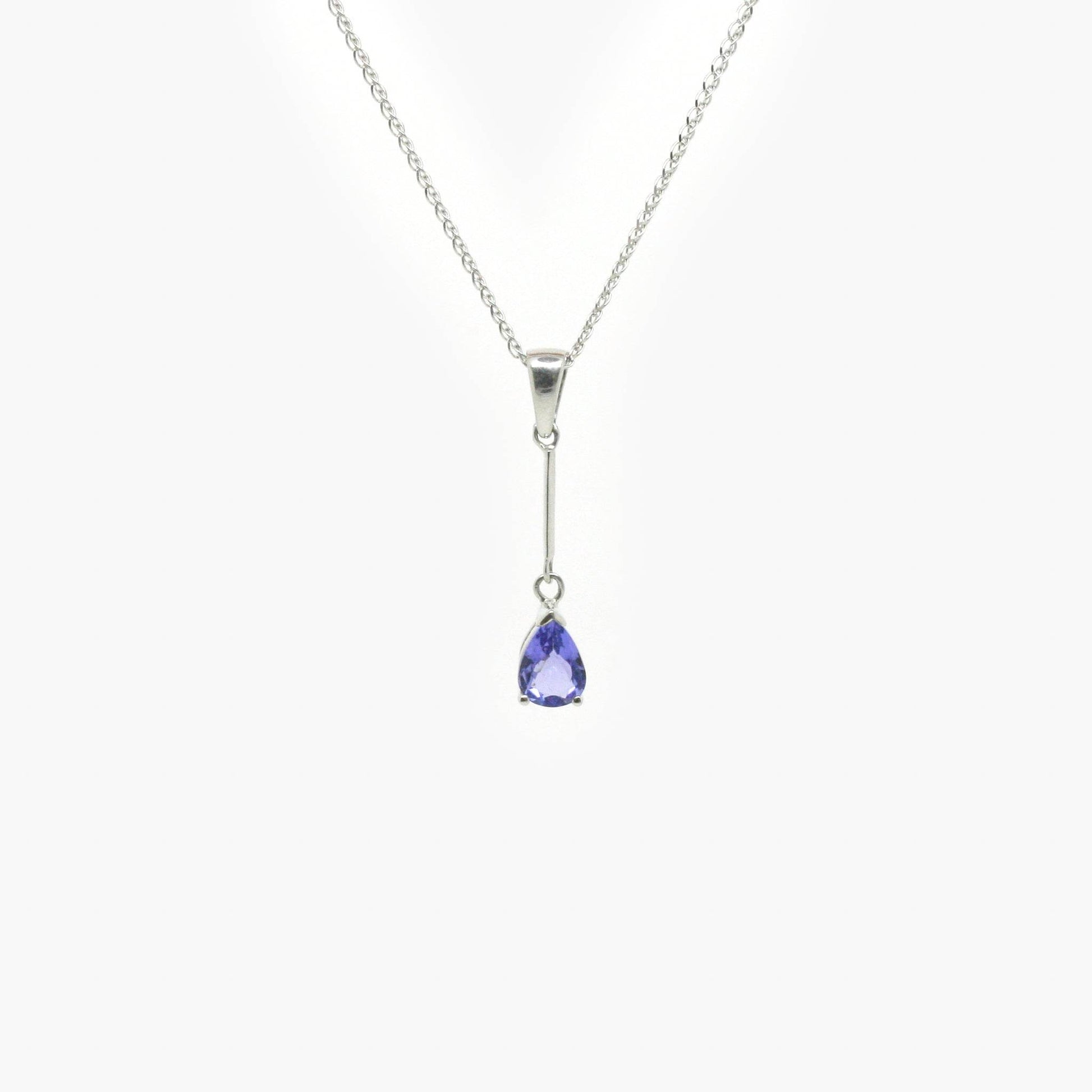 Necklace 9ct white gold bar that drops down to a 0.7x0.5cm pear shaped tanzanite in a claw setting. The pendant is suspended on an 9ct white gold 16" wheat link chain with a spring ring clasp.