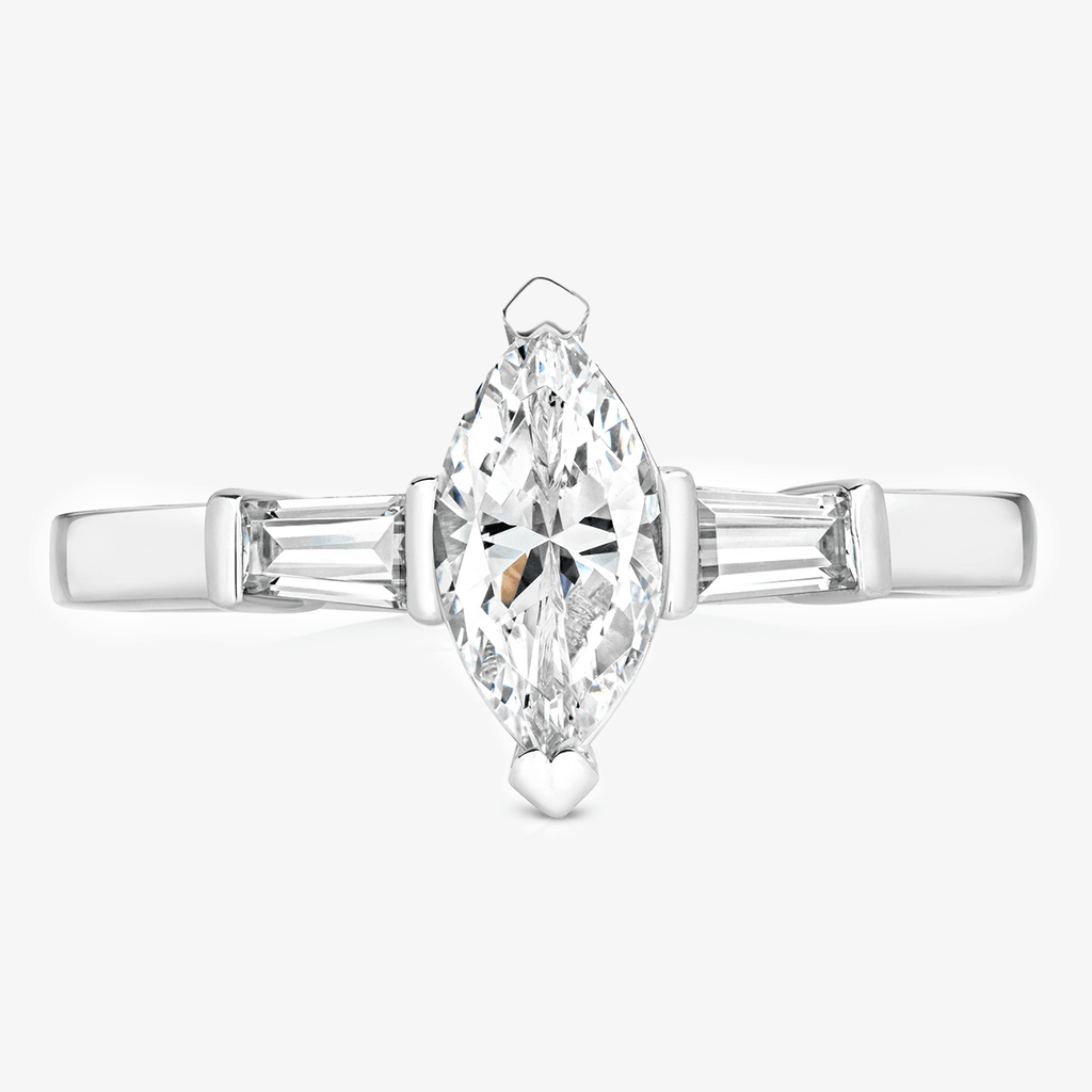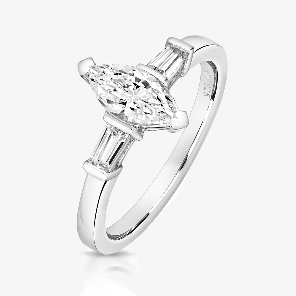 An absolute delicate darling, marquise cut white crystal, that has curves in all the right places! Paired with a beautiful crystals on each side, this exquisite ring masterpiece is a sensation of elegance.