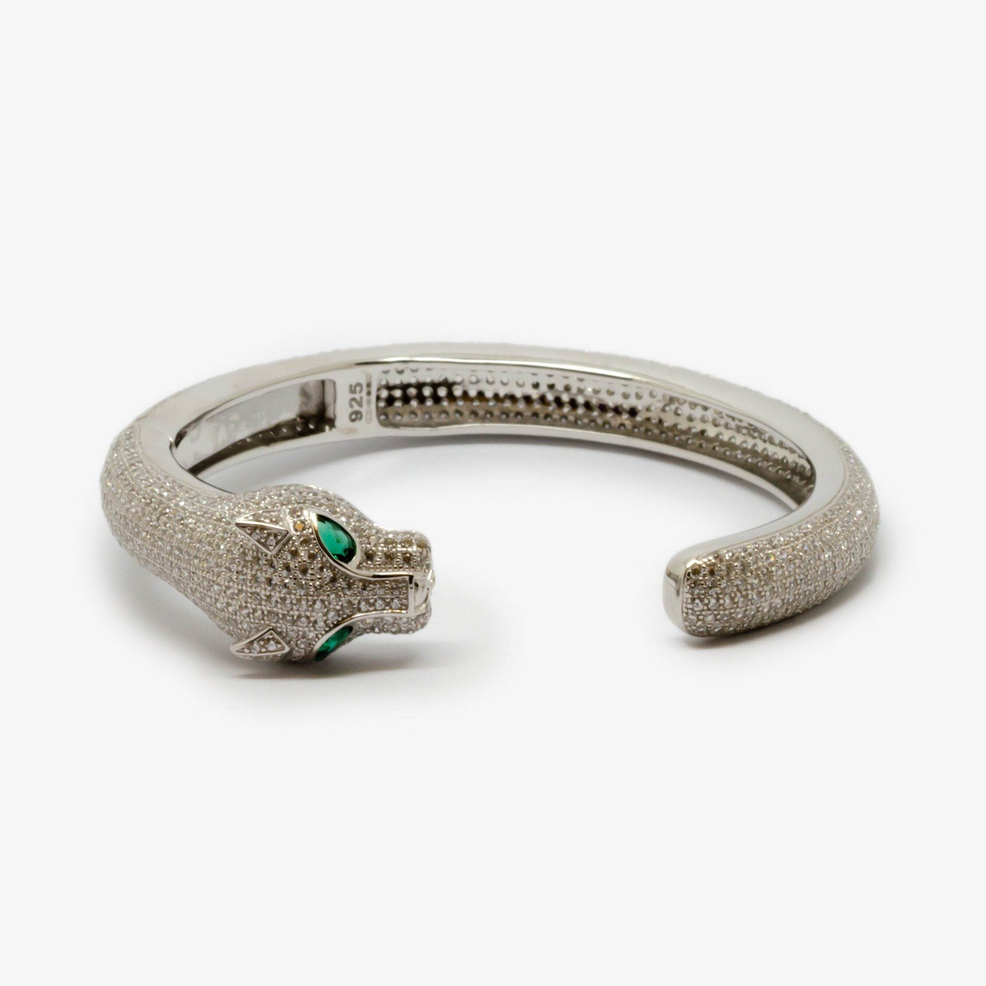 Stunning silver bracelet adorned with white and green cubic zirconia, in a gorgeous and unique panther design.