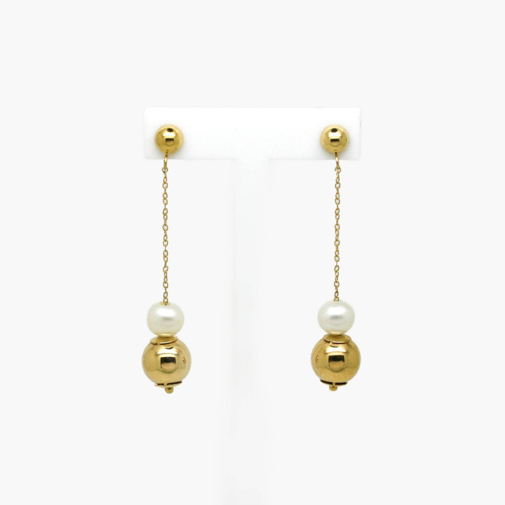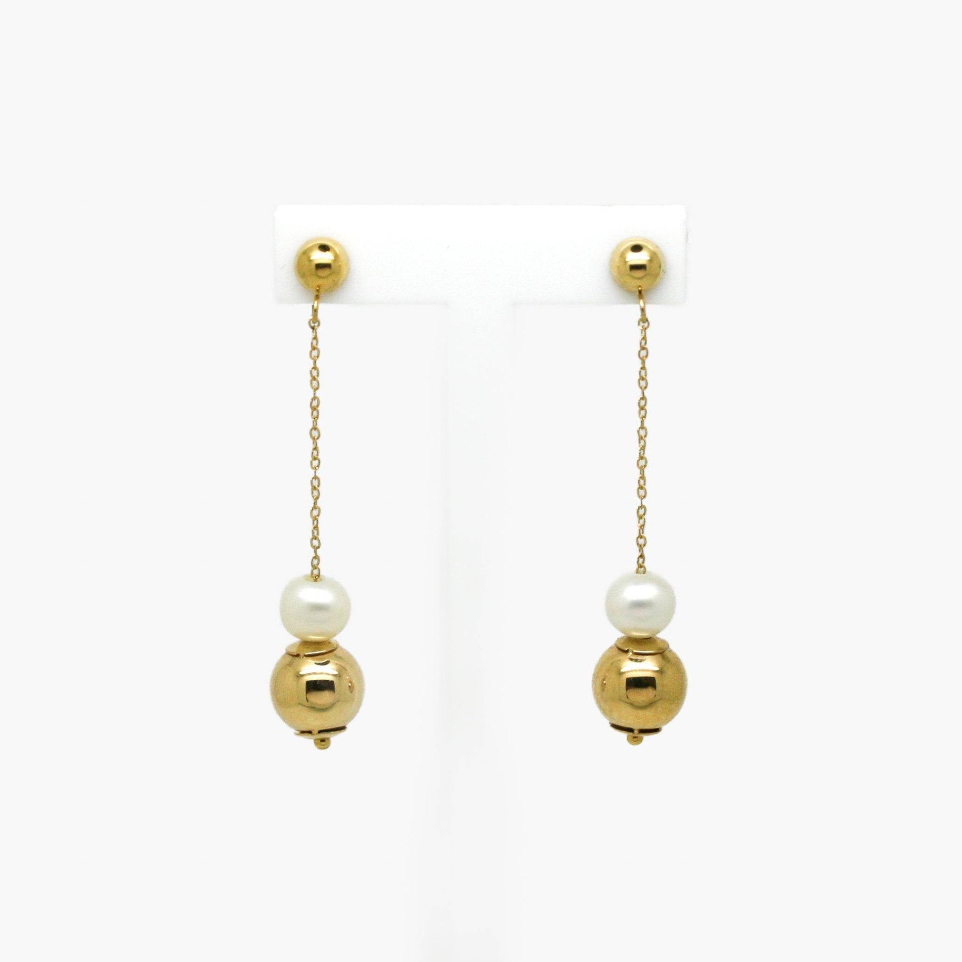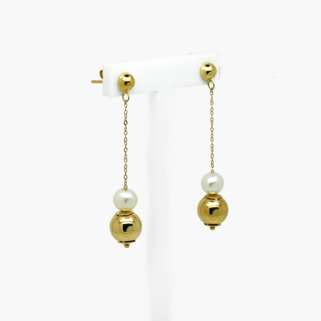 Genuine 9ct gold drop earrings featuring a lustrous pearl and polished gold balls. This elegant design offers a classic yet modern look. A truly refined statement piece.