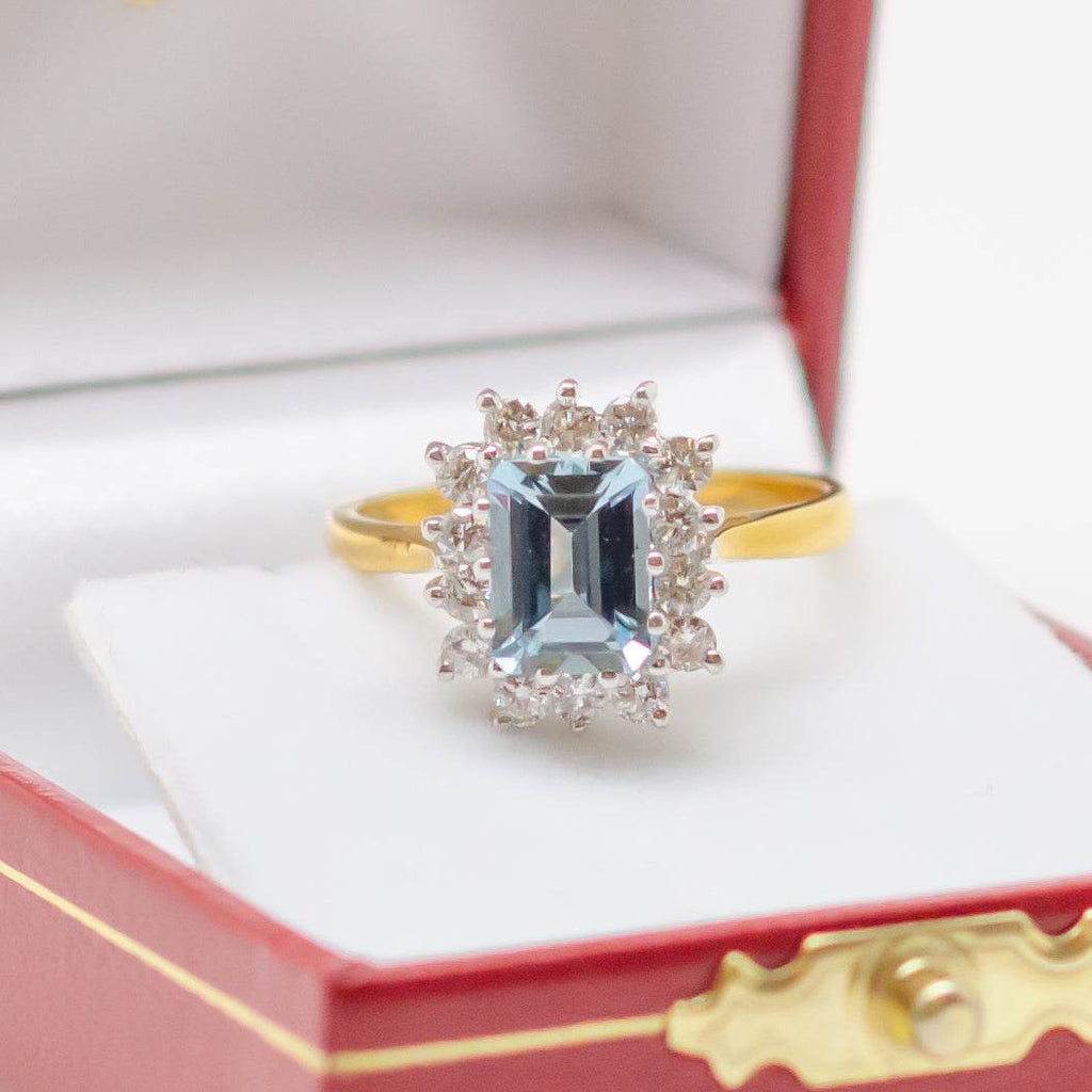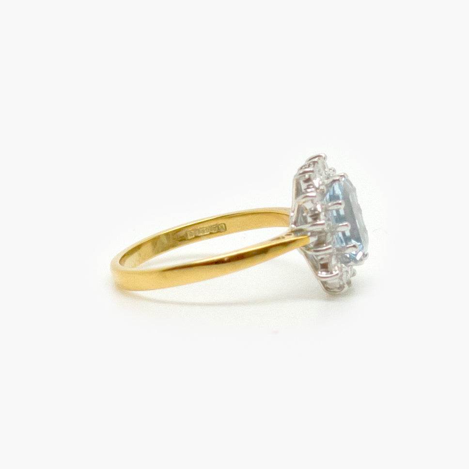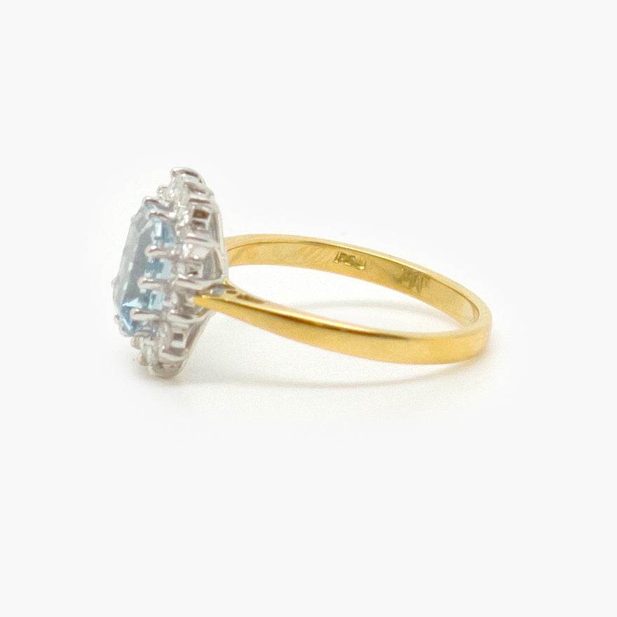 Ring in 18ct yellow gold with a white gold claw setting. The the middle of the ring sits a light blue aquamarine gemstone surrounded by a cluster of diamonds. The ring is hallmarked 750 and "FEU." The ring weighs a total of 4.5g and ring size O.