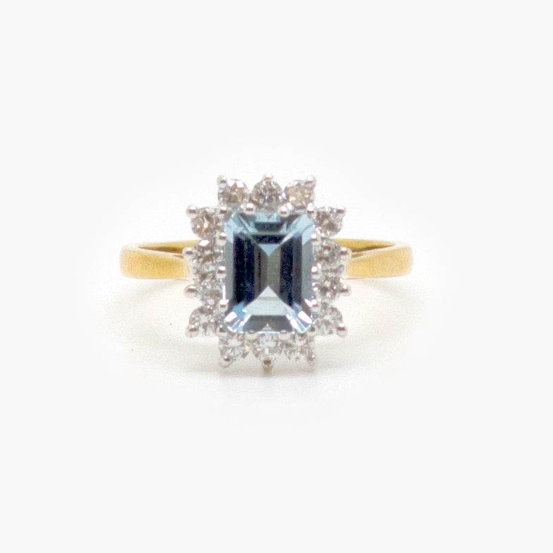 Pre-Owned Emerald Cut Aquamarine & Diamond Cluster Ring