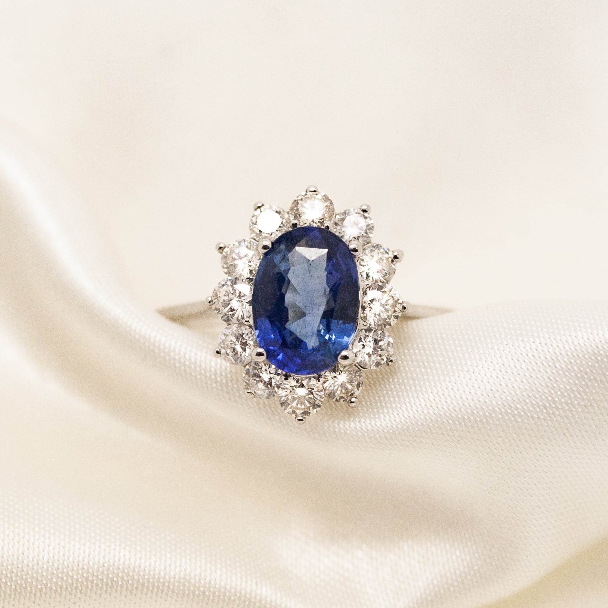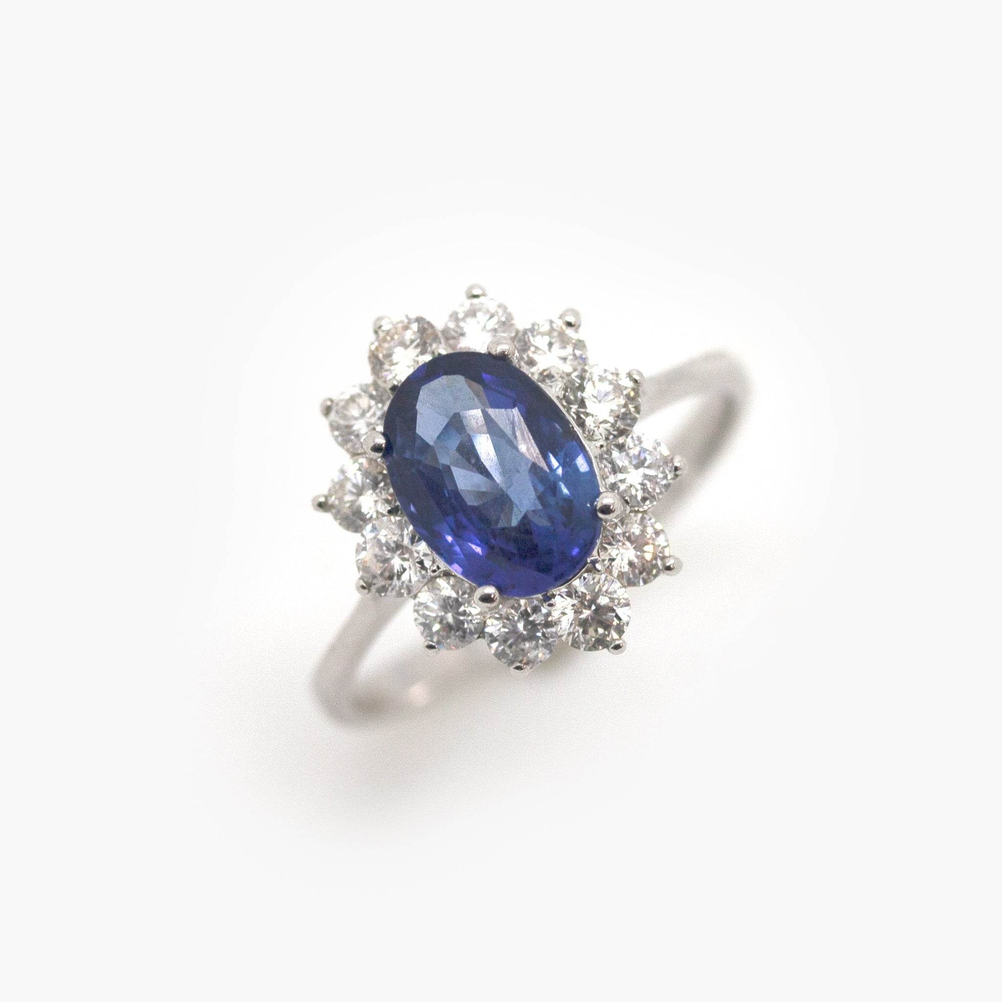 Ring in 18ct white gold with a central oval blue sapphire surrounded by diamonds. The estimated sapphire carat weight is 2.24ct and the estimated total diamond carat weight is 1.45ct. The estimated diamond colour is G and the estimated diamond colour is SI1. This ring is pre-owned and is size O.