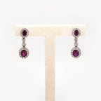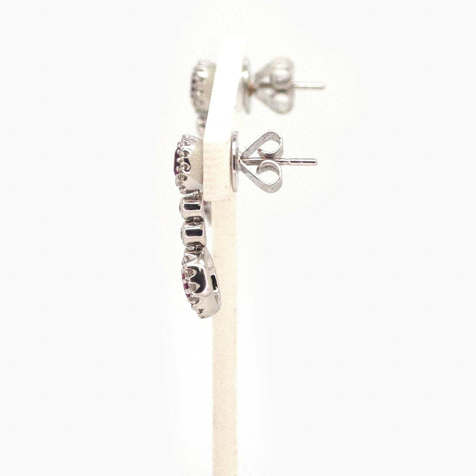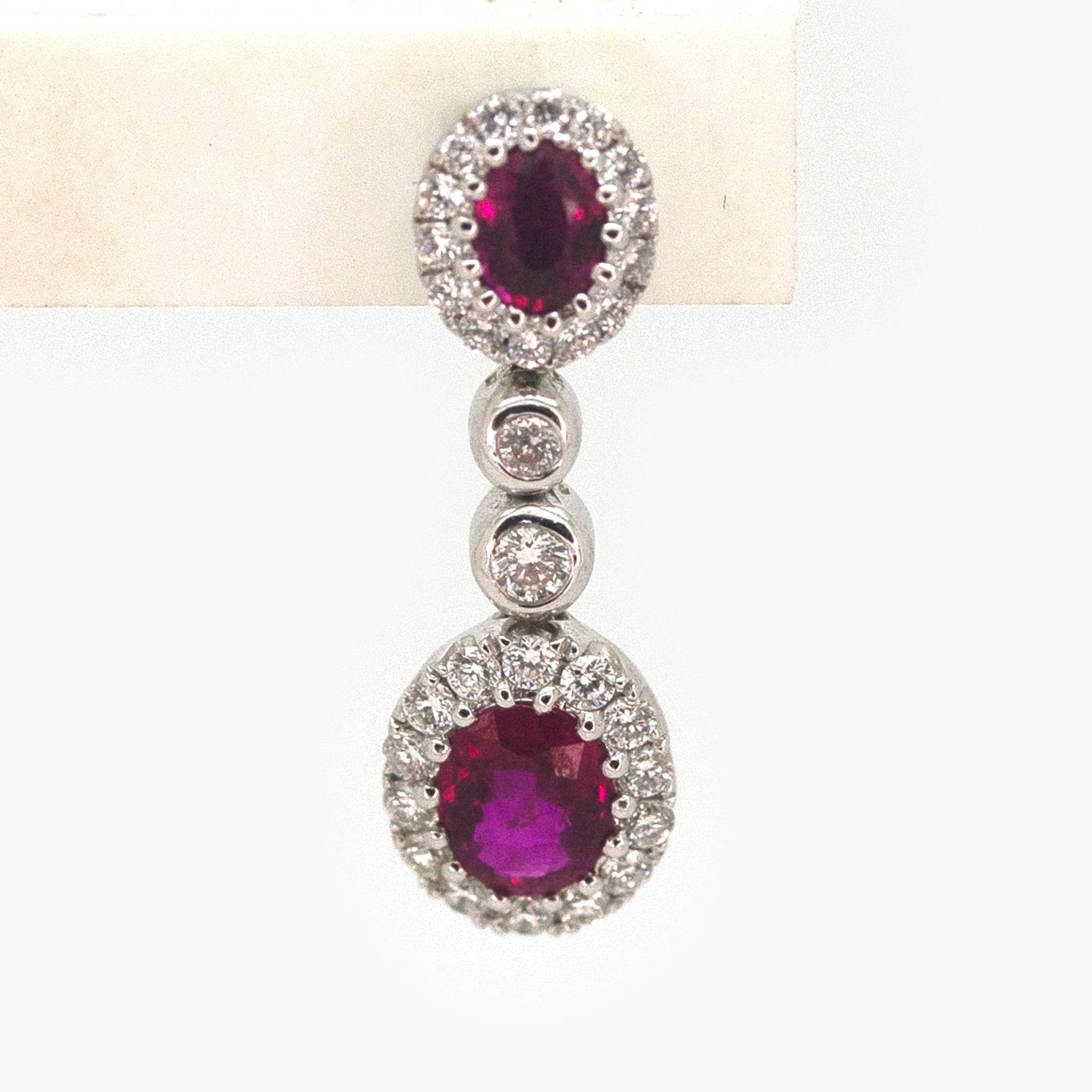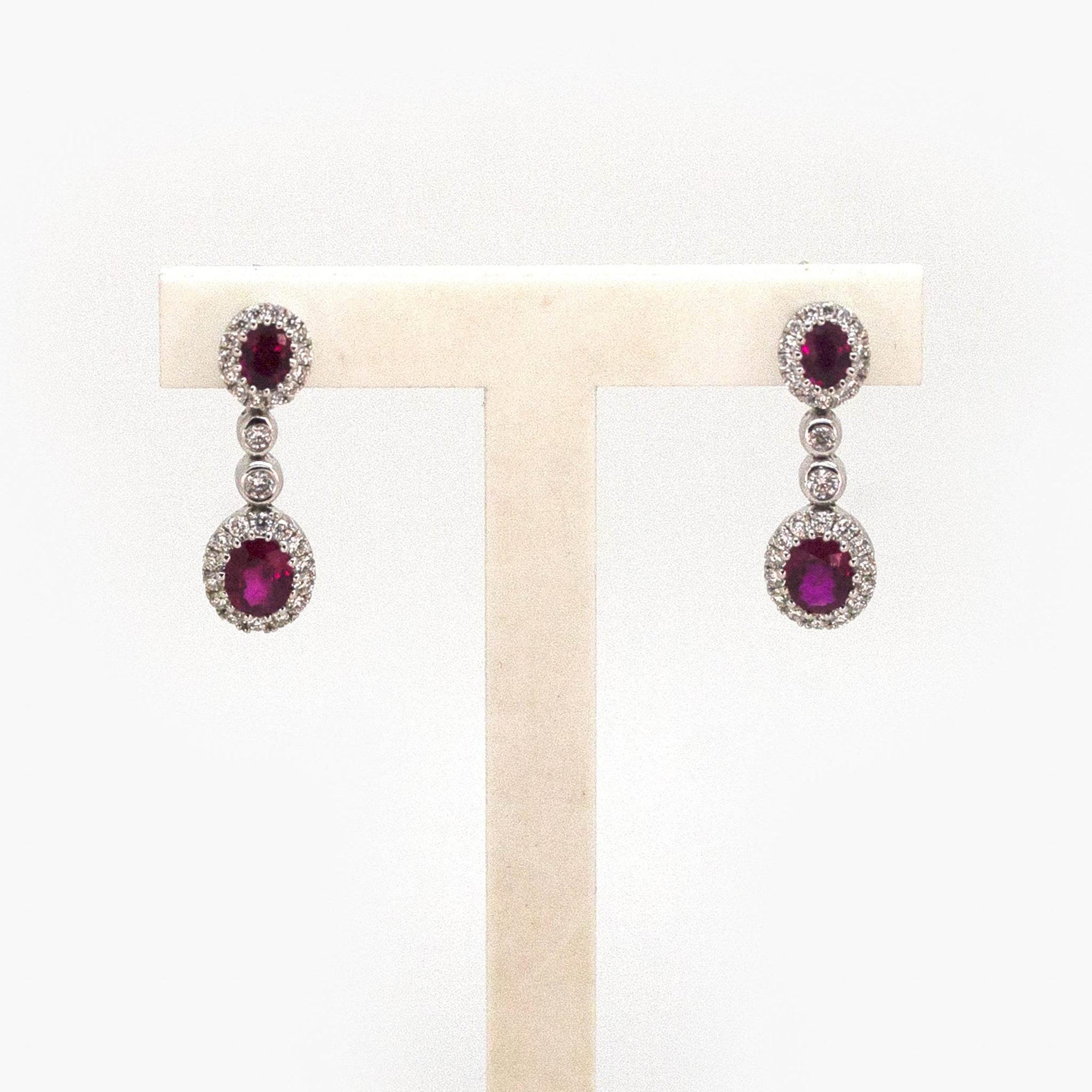 Drop earrings in 18ct white gold. These earrings feature two oval rubies each surrounded by a halo of round brilliant cut diamonds connected by two round brilliant cut diamonds in rubover settings. These earrings have a total estimated ruby carat weight of 1.12ct and a total estimated diamond carat weight of 0.45ct. The diamond colour is G and the diamond clarity is SI1. The length of the bottom ruby is 0.5cm and the width is 0.4cm. These earrings are pre-owned and have butterfly backs.