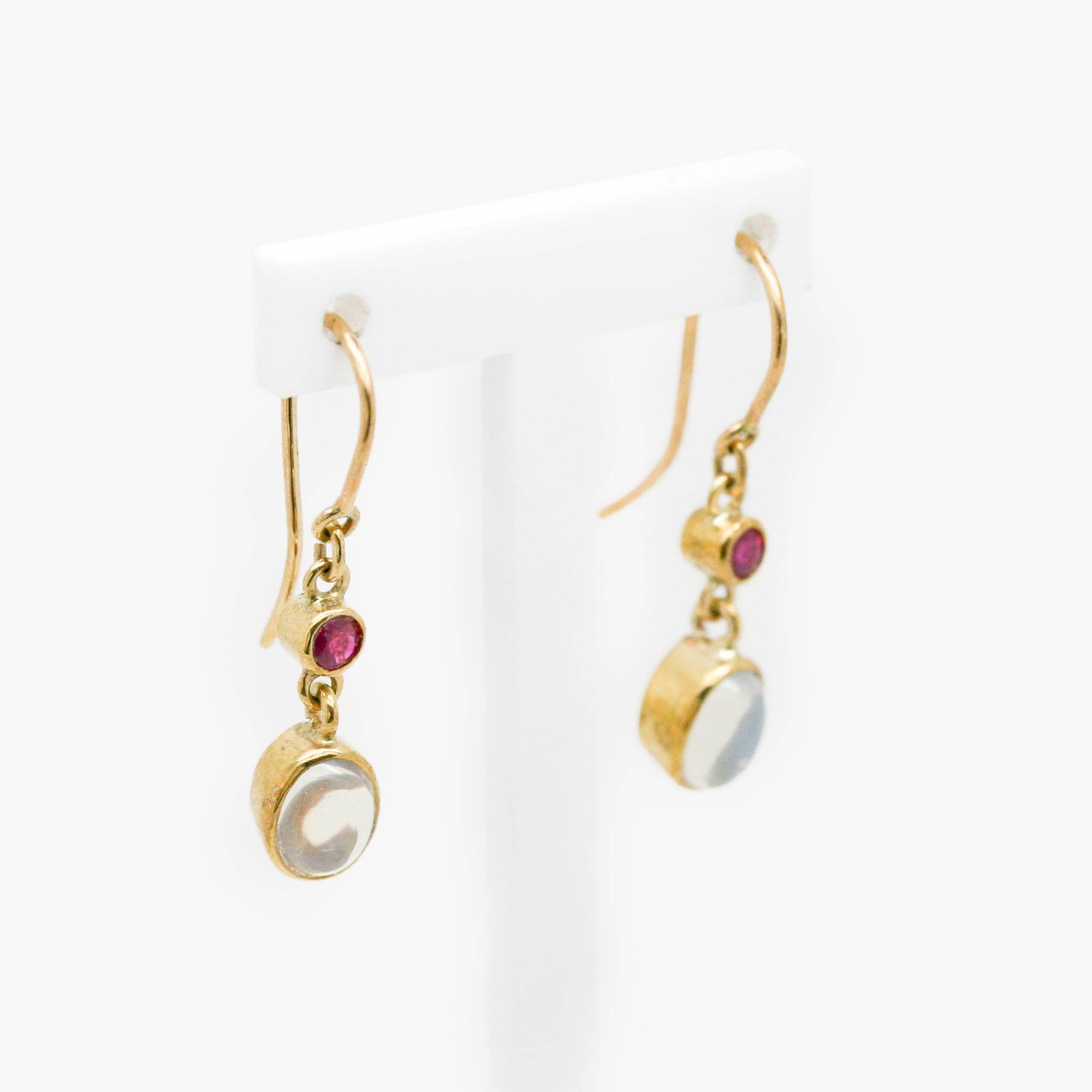 This beautiful set of drop earrings feature round ruby gemstones sat just above an oval shaped moonstone. The gems are set in 9ct gold with fish hook backs.