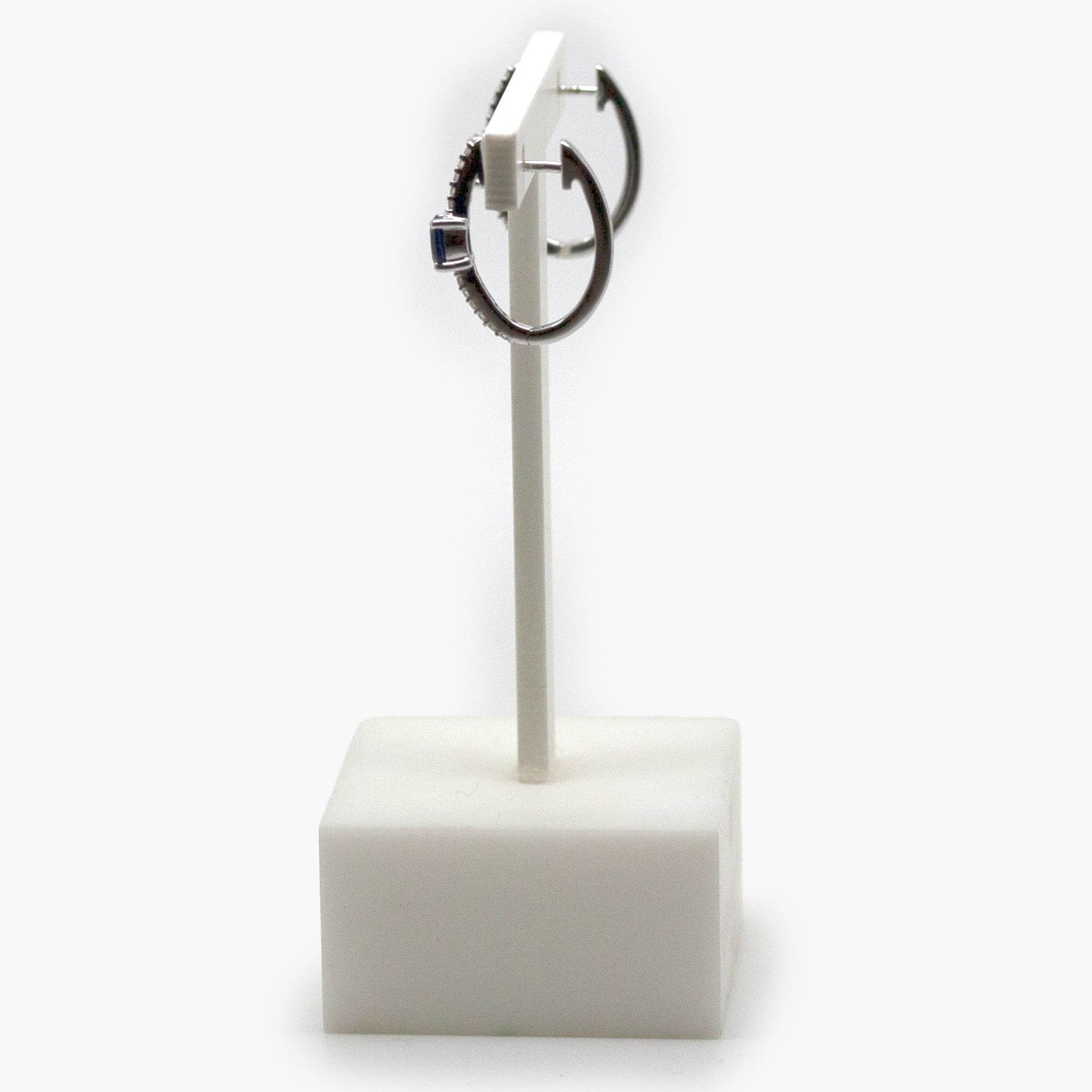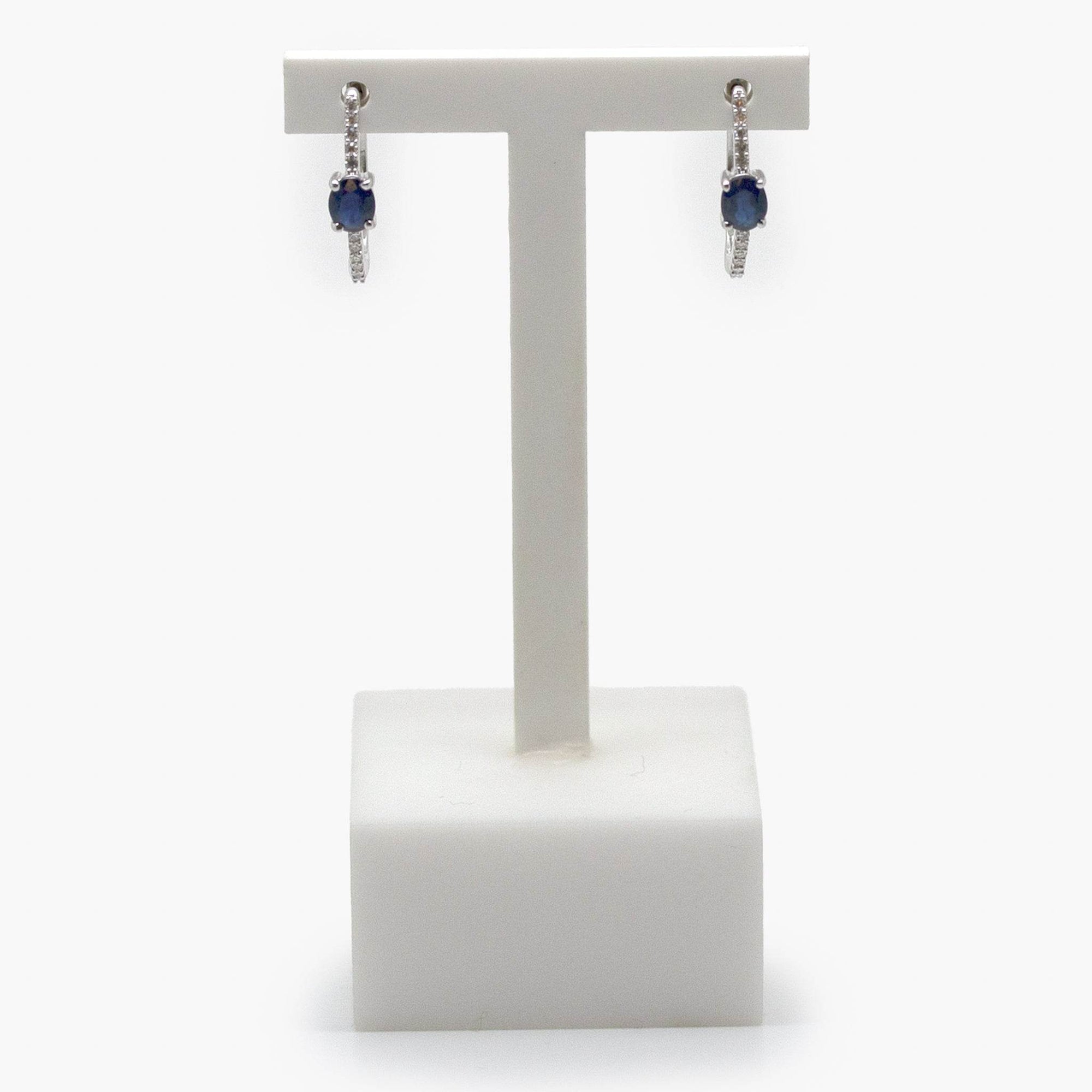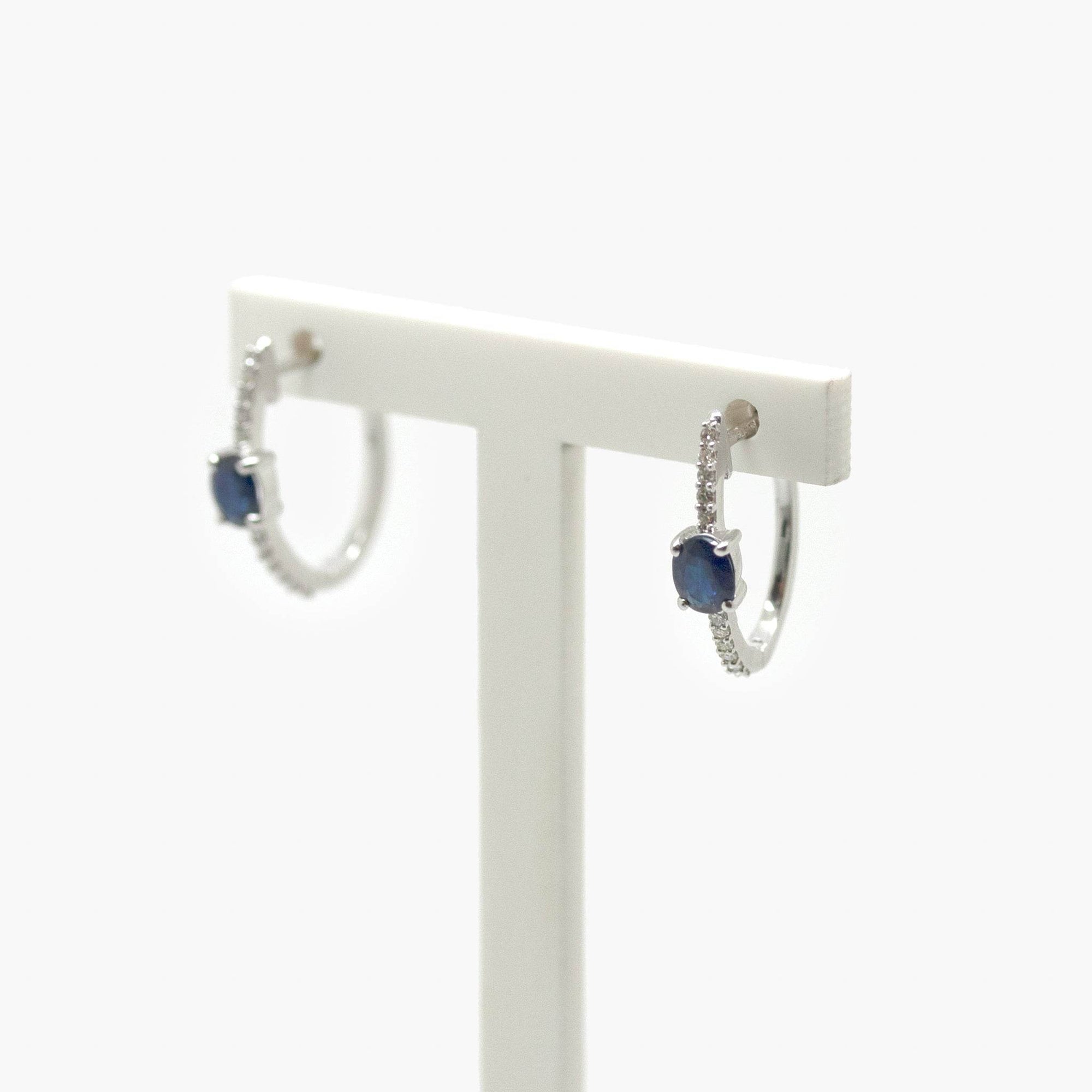 Earrings in 9ct white gold with an oval sapphire gemstone in the middle of the hoop in a claw setting with a line of diamonds. The estimated carat weight of the sapphire gemstone is 0.35ct each making the total 0.70ct. The total carat weight of the diamonds is 0.31ct. The huggies are hinged with a post a catch fastening.