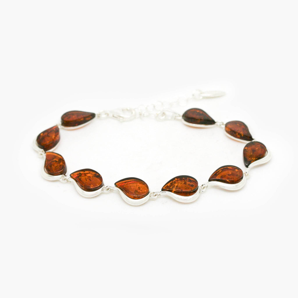 This bracelet has warm amber stones in a tear drop shape, set in silver stamped 925. The bracelet measures 7-9 inches.