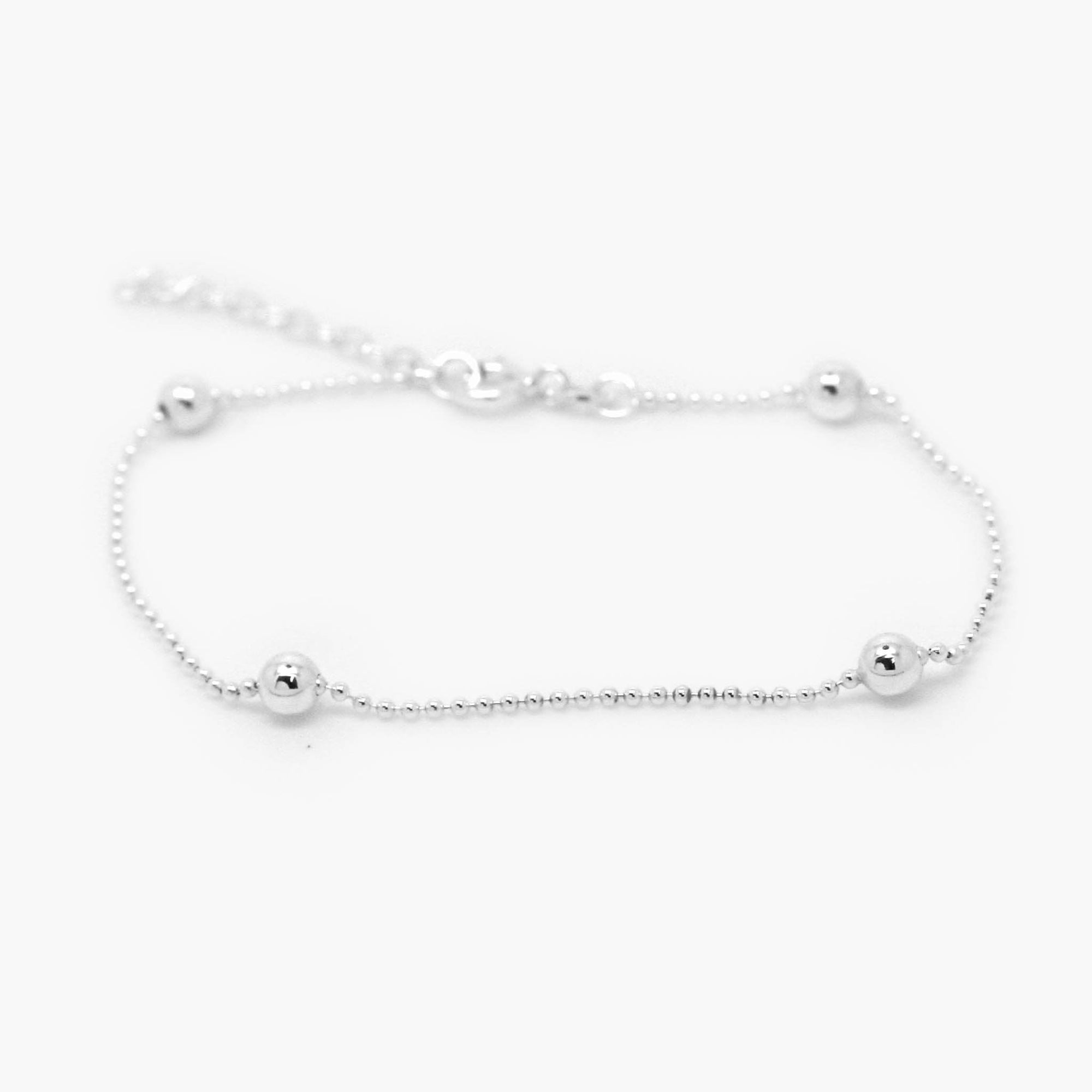 A beaded chain bracelet with smooth, round ball accents spaced evenly along the strand. Finished with a small clasp and extender for adjustable sizing.