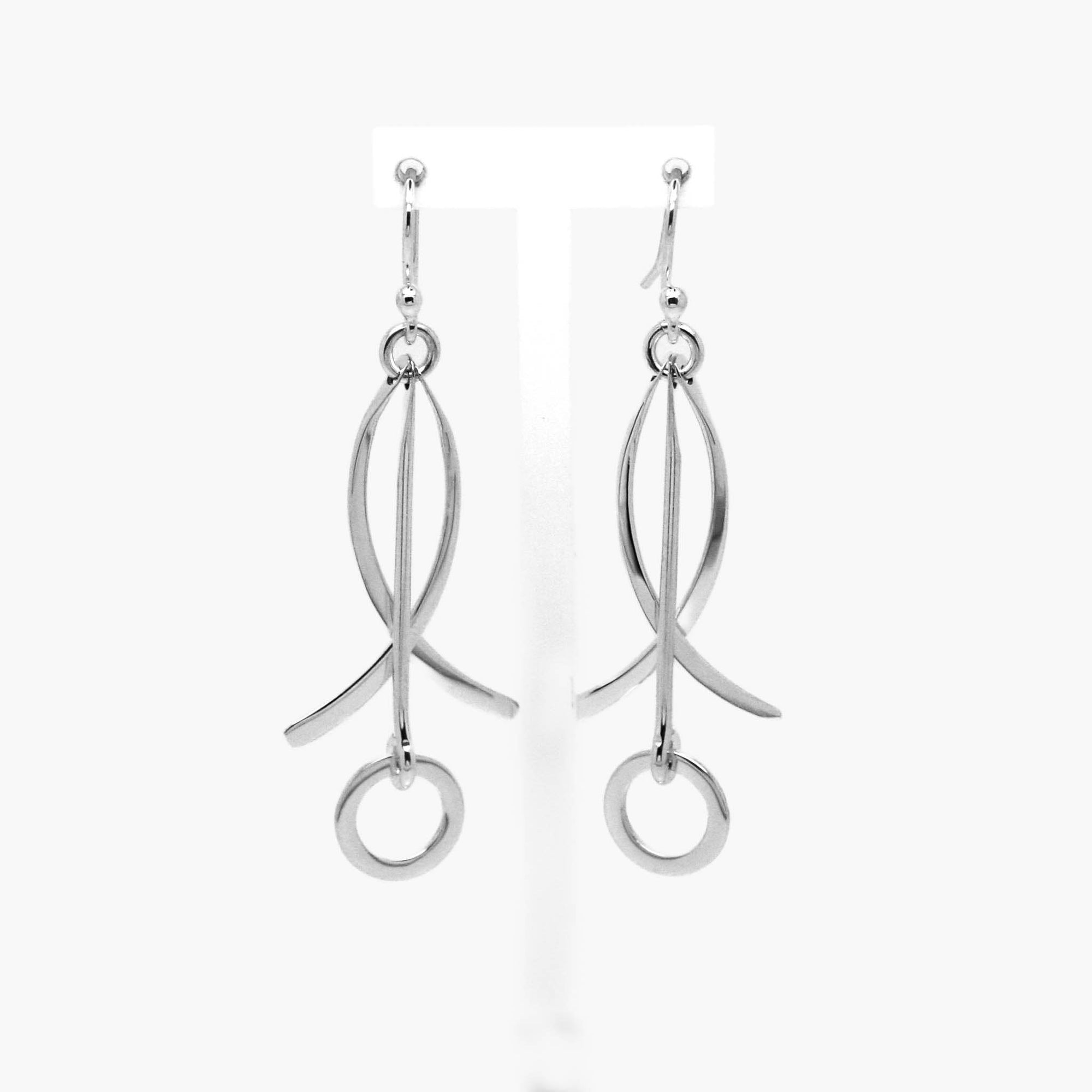 Striking sterling silver earrings with twisted bar and circle drops, crafted in an abstract form. Lightweight design, perfect for everyday wear or evening looks.
