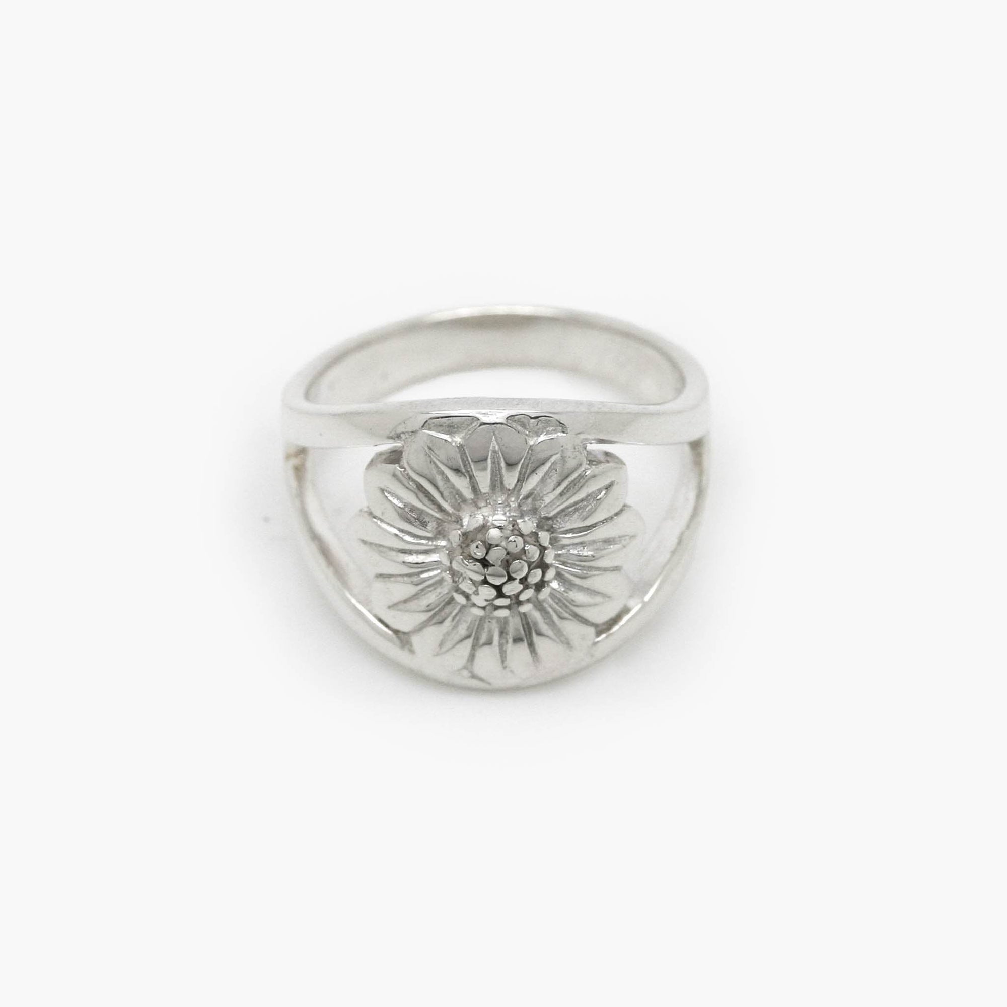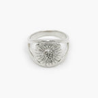 Elegant sterling silver ring featuring a detailed flower design with intricate petal and center textures. A timeless nature-inspired statement piece.