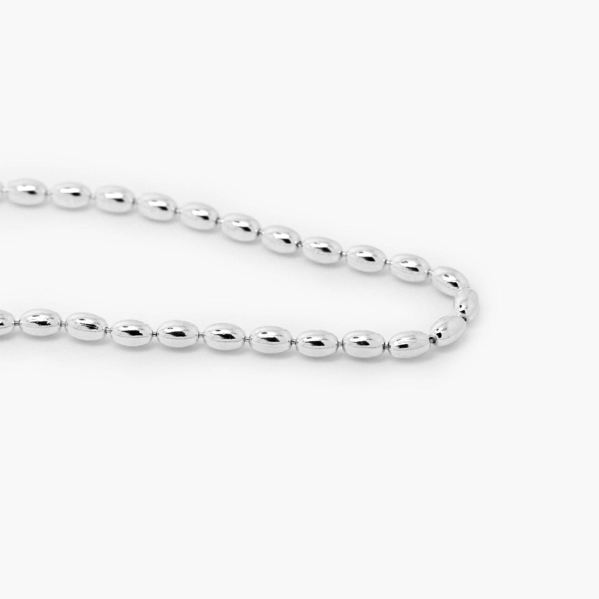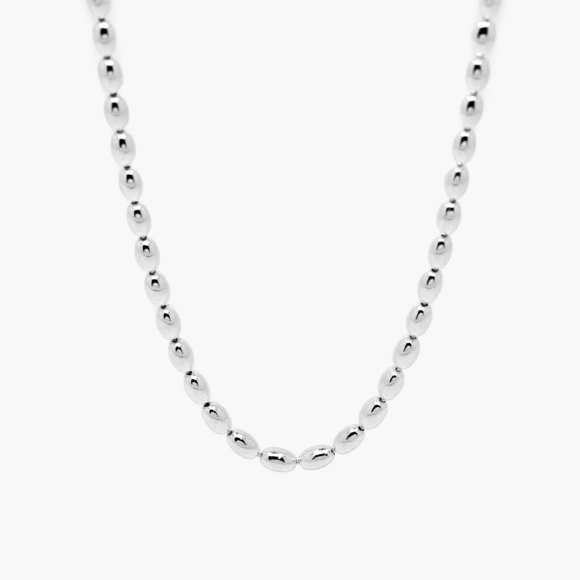 Necklace made from a series of evenly spaced oval-shaped beads with a polished surface. Each bead is smooth and slightly rounded, creating a uniform pattern.