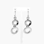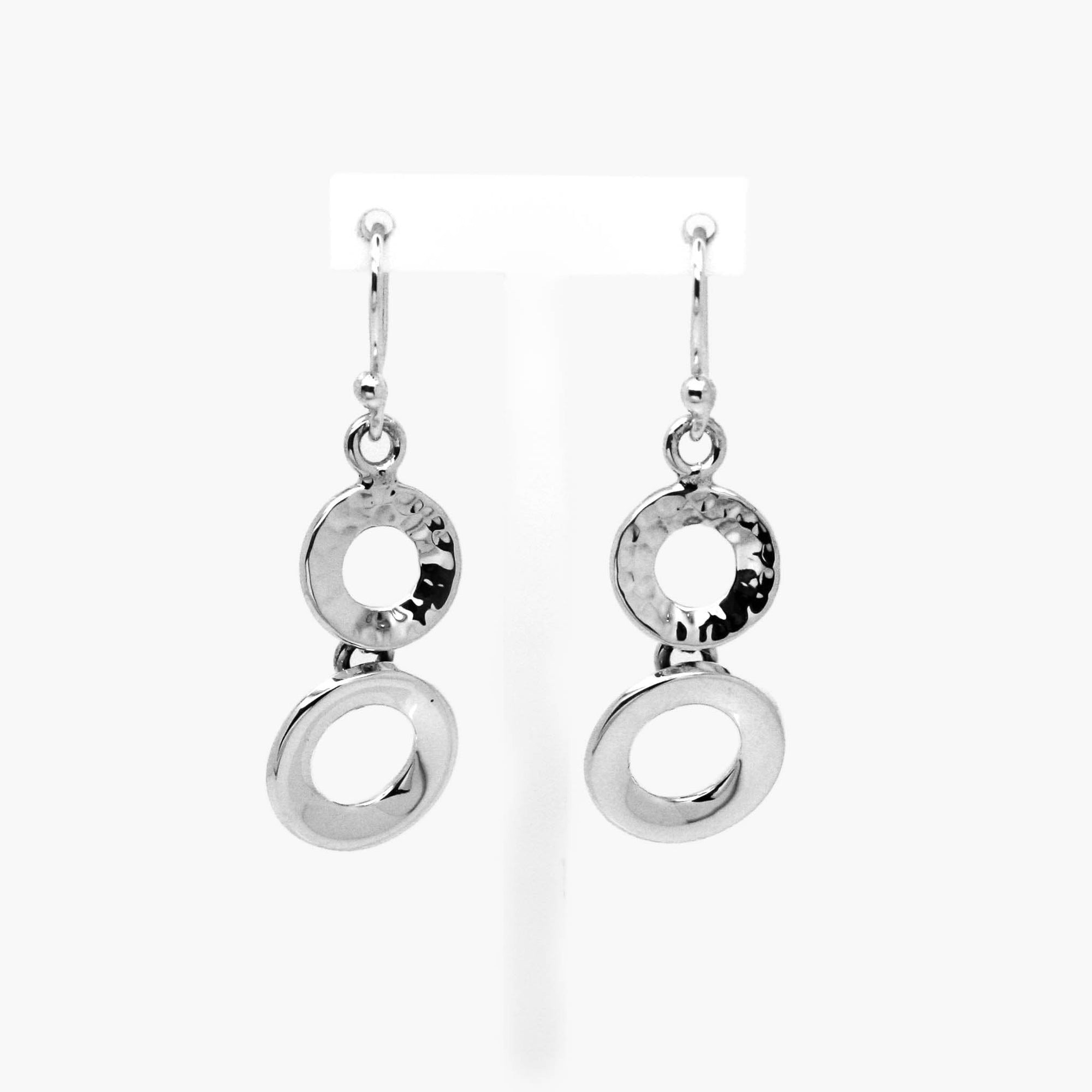 A pair of silver earrings featuring two connected open circles. The top circle has a hammered texture, while the lower one is smooth and rounded.