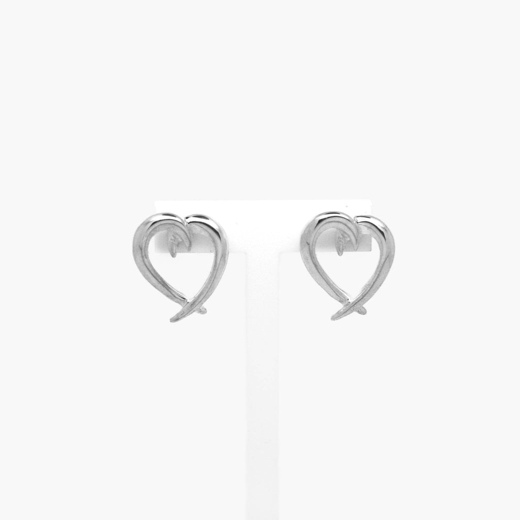 Stud earrings crafted in polished silver, shaped into overlapping open-heart forms with tapered tips. Secured with classic butterfly backs for pierced ears.