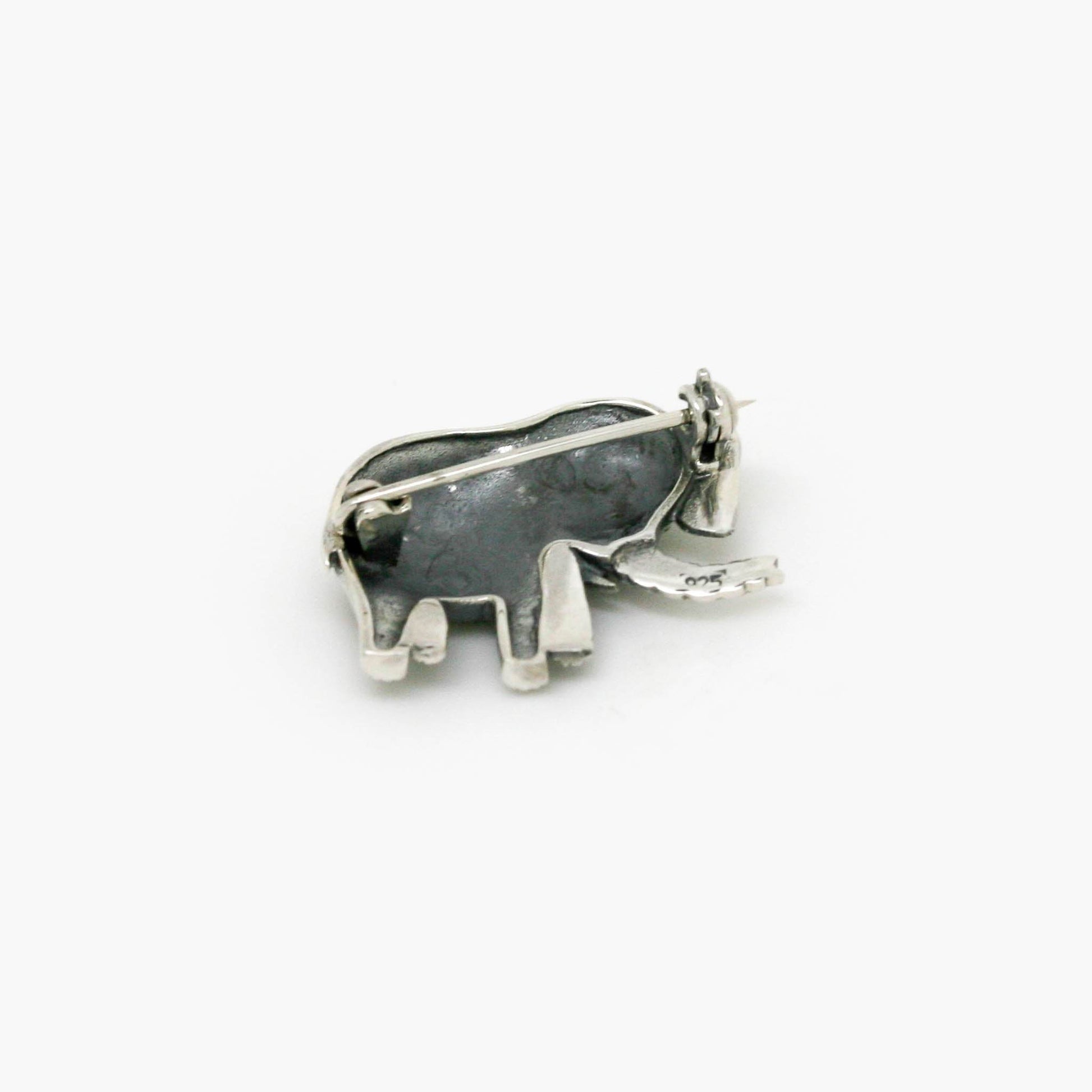 Silver elephant brooch with marcasite stones, featuring textured detailing and a polished finish. Compact and sturdy with a secure pin backing.