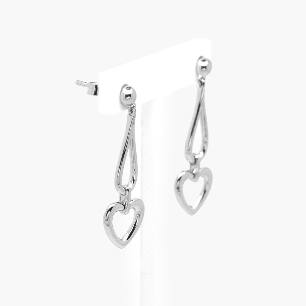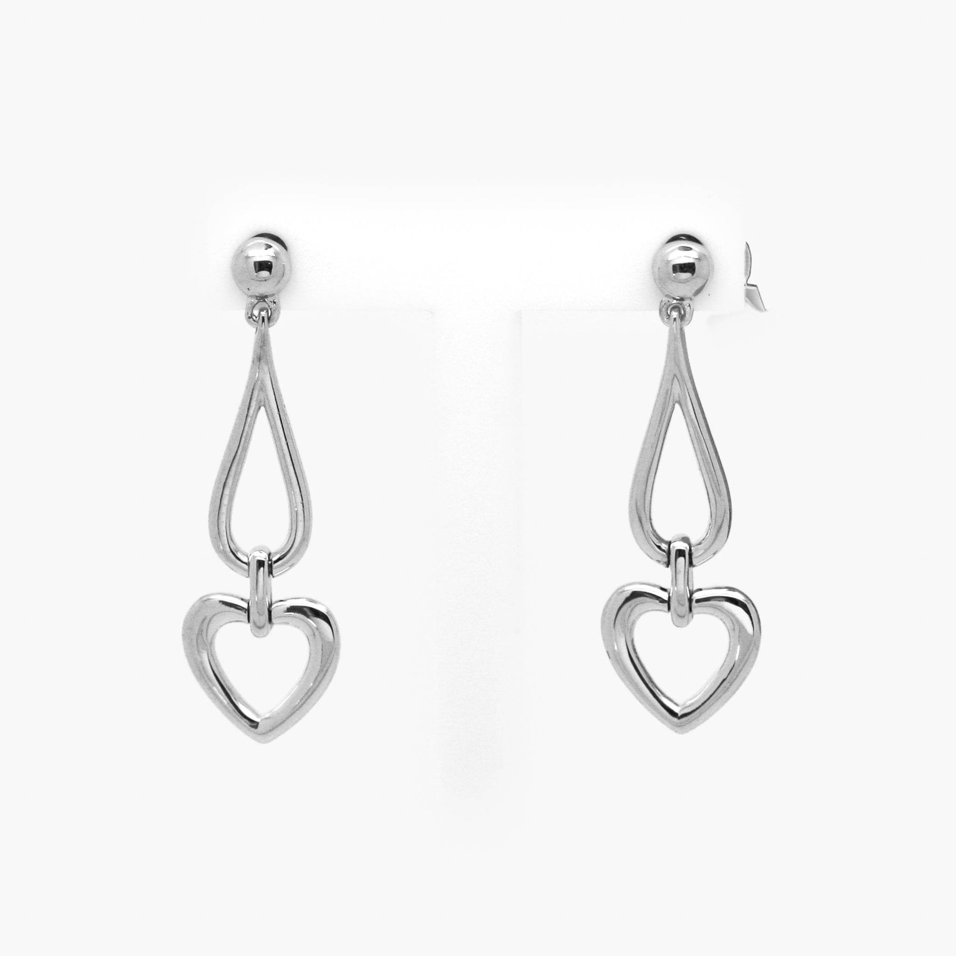 Chic sterling silver drop earrings with teardrop tops and open heart charms. Lightweight and stylish, perfect for everyday wear or a romantic gift.