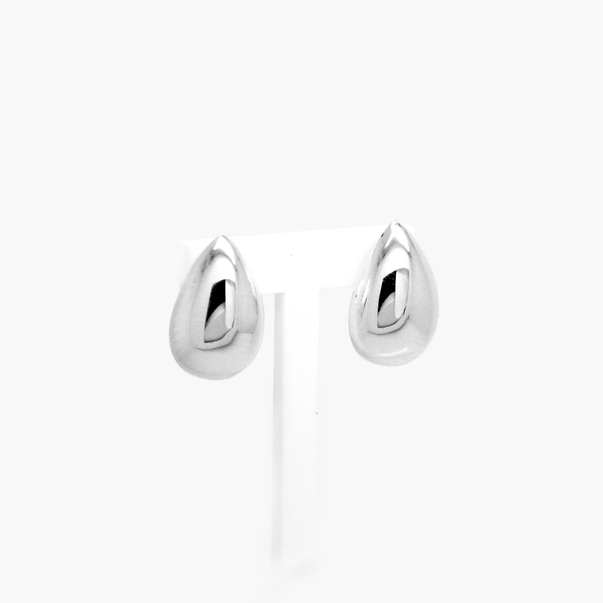 Compact sterling silver teardrop studs with a high-polish finish. Smooth surfaces and rounded volume give a soft, sculptural look from every angle.
