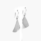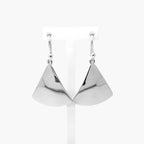 A pair of silver earrings featuring tapered triangle drop forms. The surface is smooth and reflective, with curved edges and a lightweight profile.