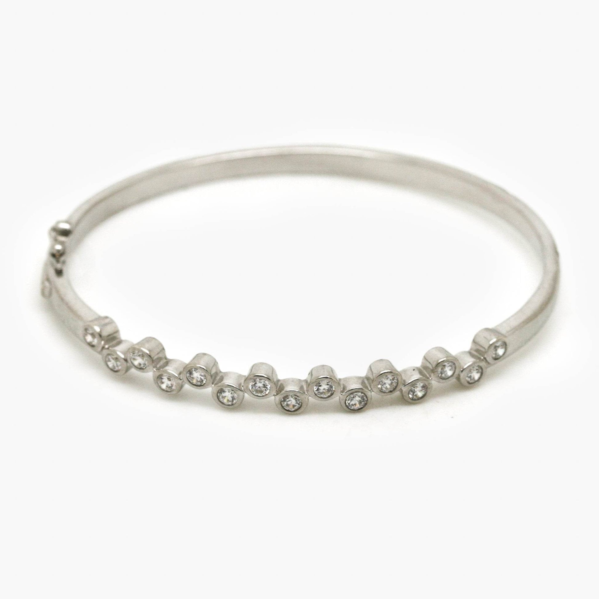 Experience brilliant sparkle with our wavy CZ silver bangle. This sleek, modern women's bracelet, adorned with dazzling stones, makes an unforgettable gift. Shop now!