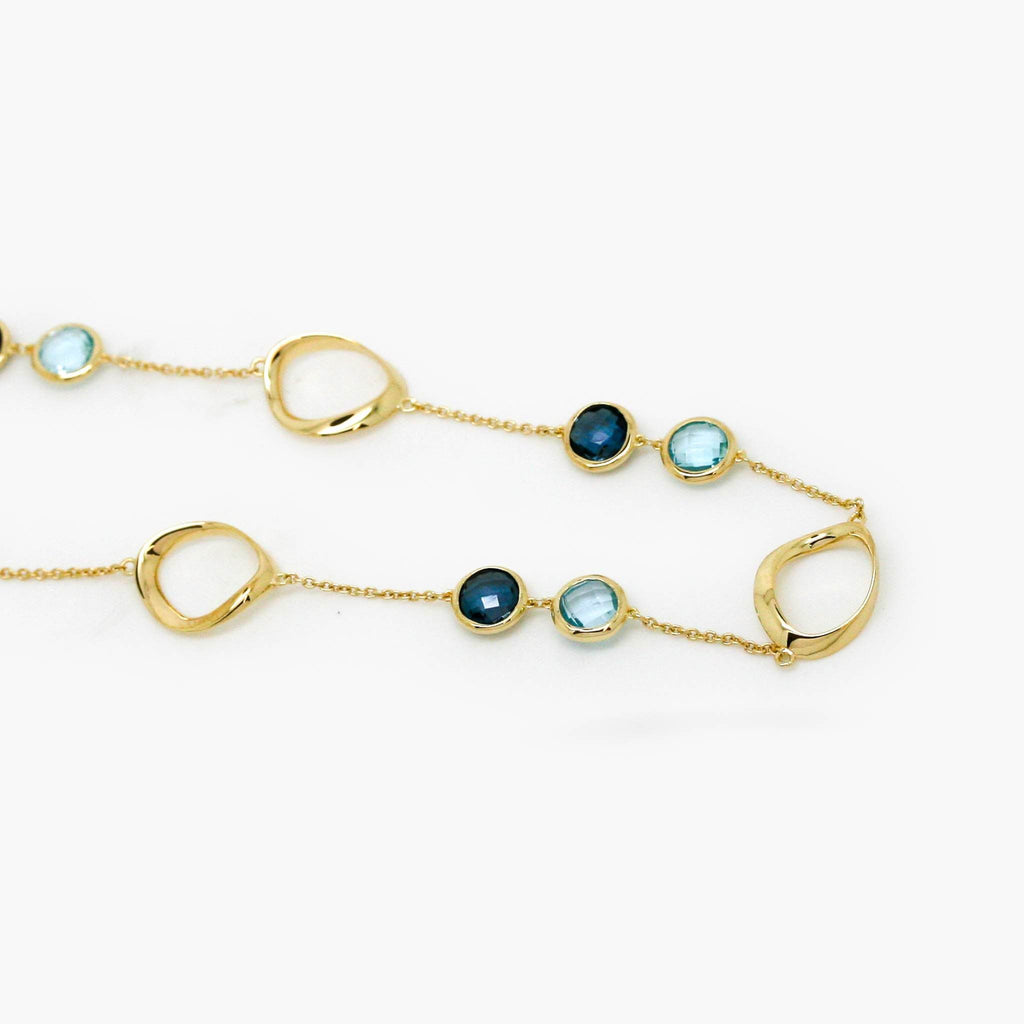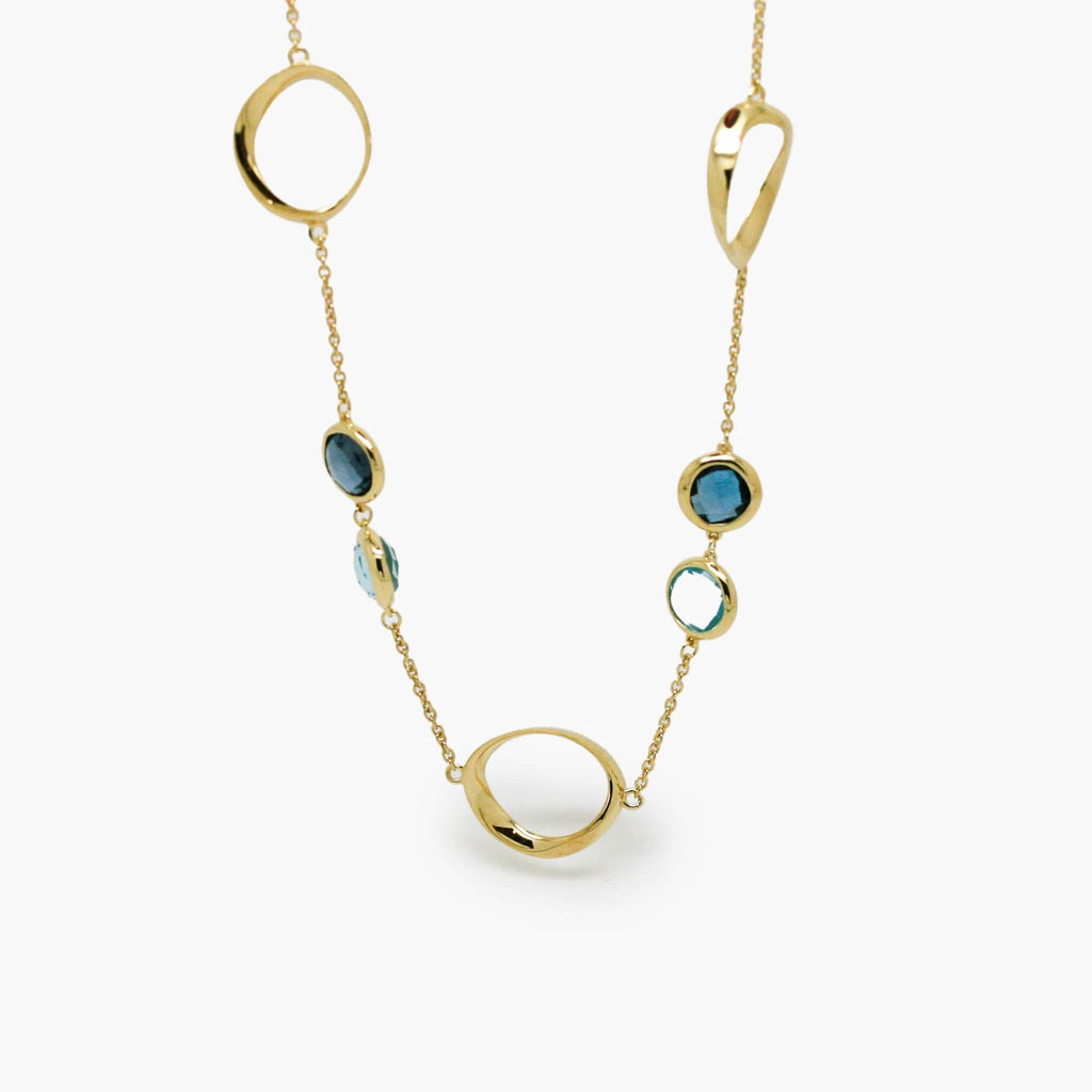 A 9ct gold necklace featuring Sky and London blue topaz stones, interspersed with polished open shapes for a light, flowing feel.