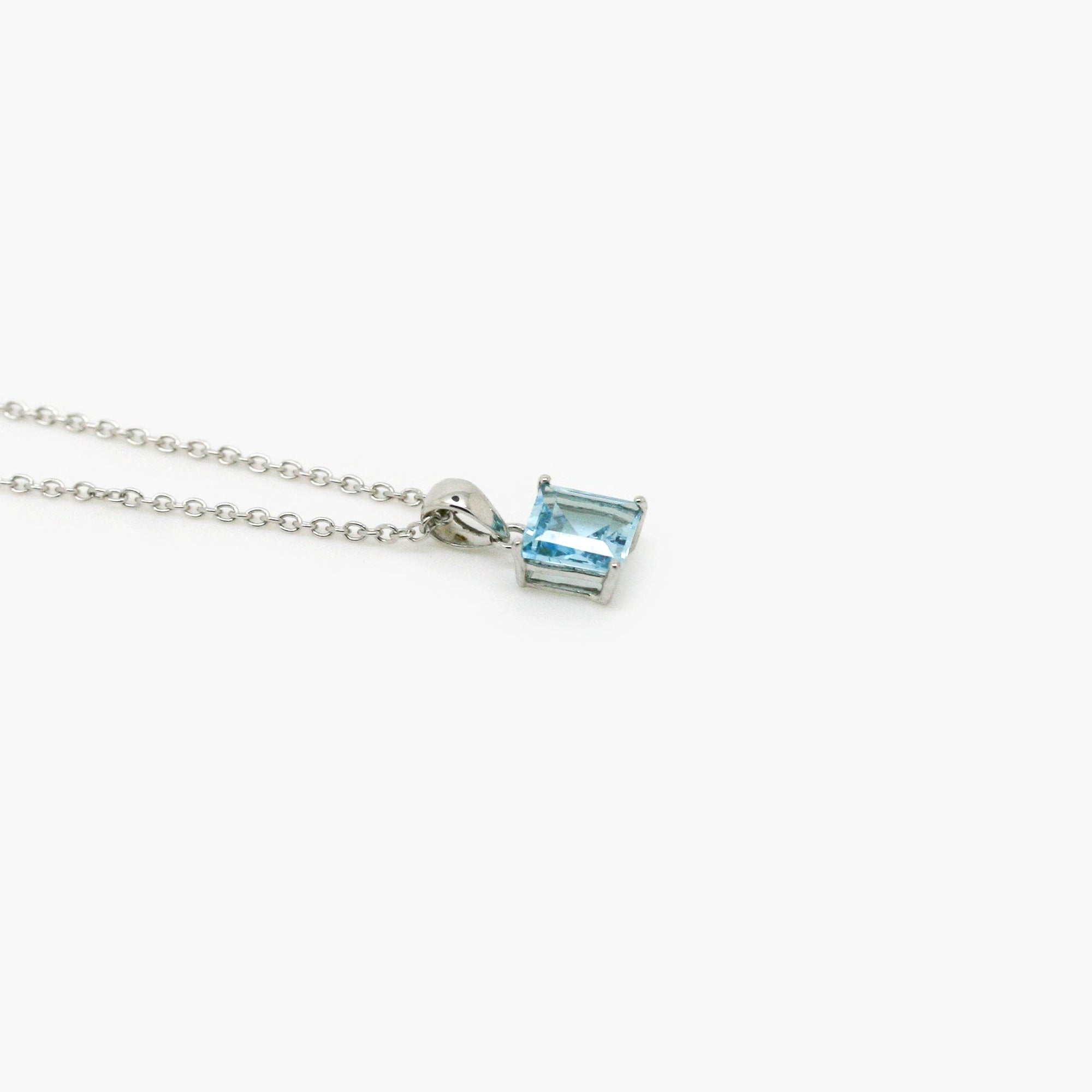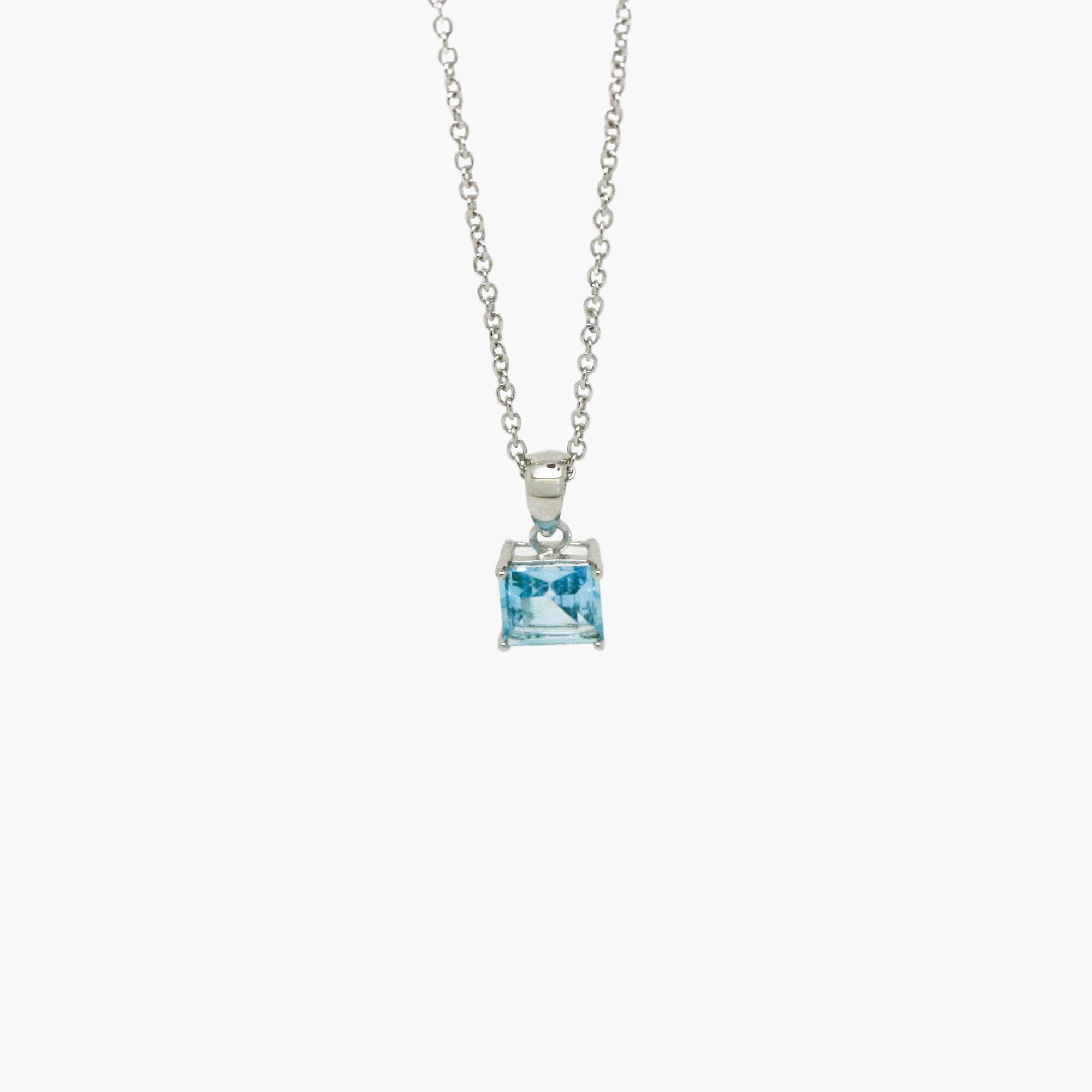 This new pendant necklace features a blue topaz gemstone in a square shape, set in a 9ct white gold setting on a 16" white gold curb chain.